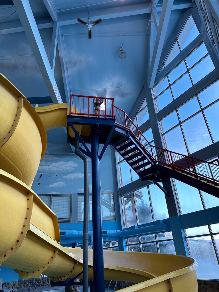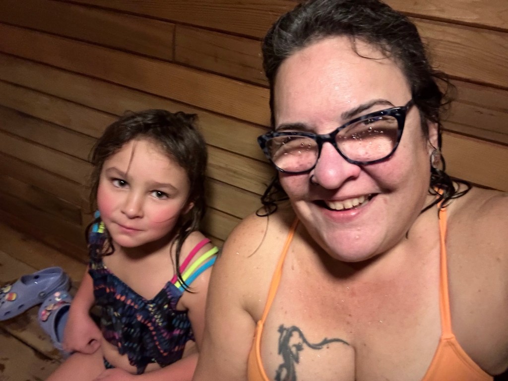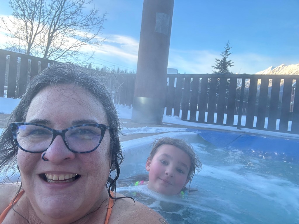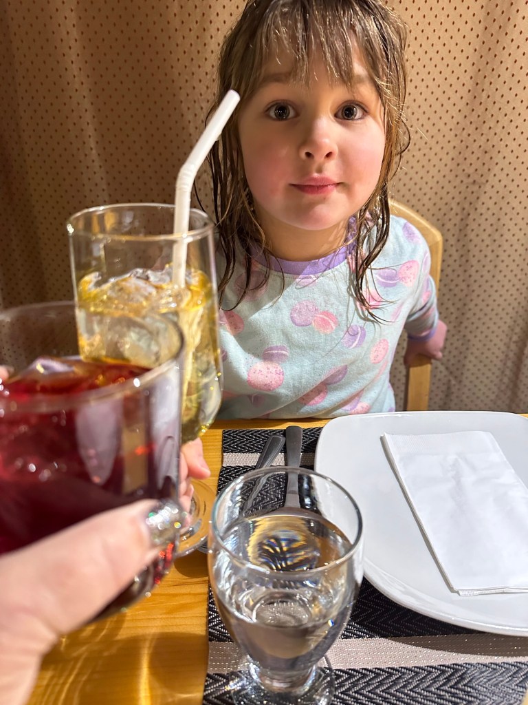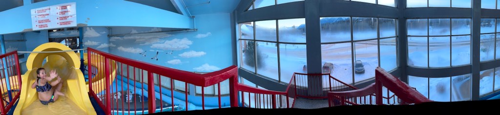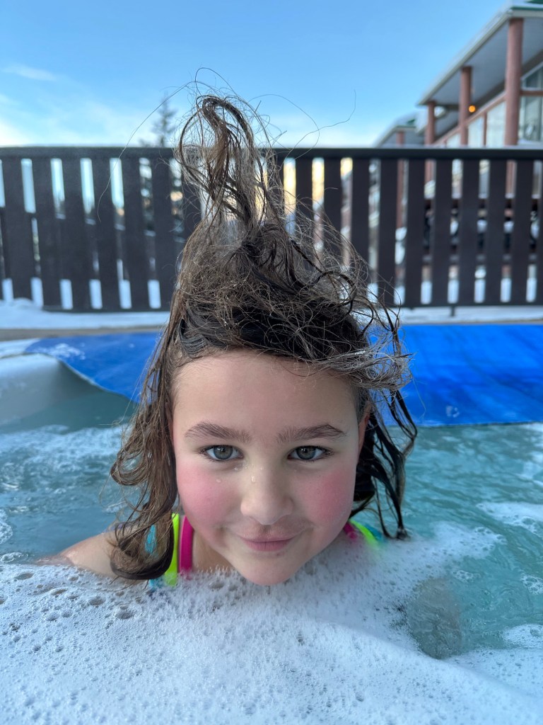Back to the room we went to get into our bathing suits. Emmy had the idea that because we both had new ones I should change in the bathroom while she changed near her bed and then we would have the big reveal. She was so sweet and complimentary about mine and she was cute as a button in hers. We went and spent an hour and half in the pool and for all but 15 minutes of it we had the entire place to ourselves. We went on the water slide, had swimming games and challenges, and even went out for a hot tub in the cold. We both made the mistake of touching the metal railing and our fingers stung for a bit. I showed her how to make crazy hairdos by messing it up as it froze. She told me it was a little bit hard to tell if mine was frosty as it was already a lot white. We then rushed back in to get in the pool for a bit longer before hitting the Sauna. It wasn’t warm enough so it was back to the room for hot showers. Ms E went first and left the shower on for me to get in. She had put the plug in and turned it to full hot, the little monkey. After the showers she did say that my hair is mostly white only on top and mostly dark everywhere else. She must have decided that needed clarifying.