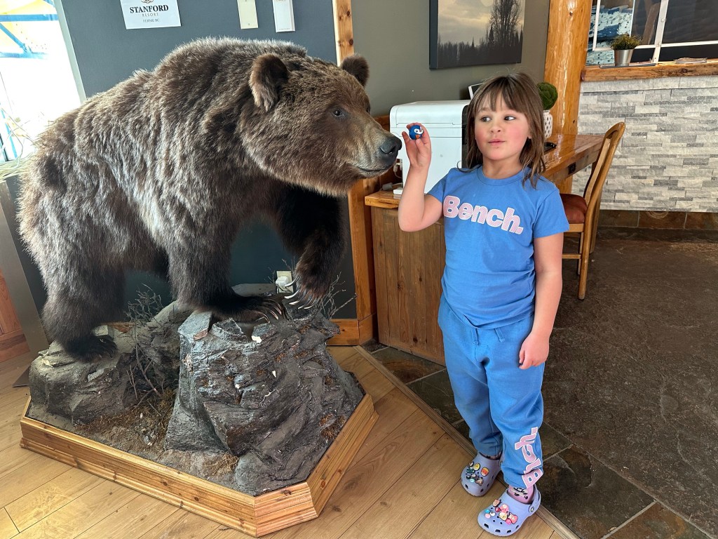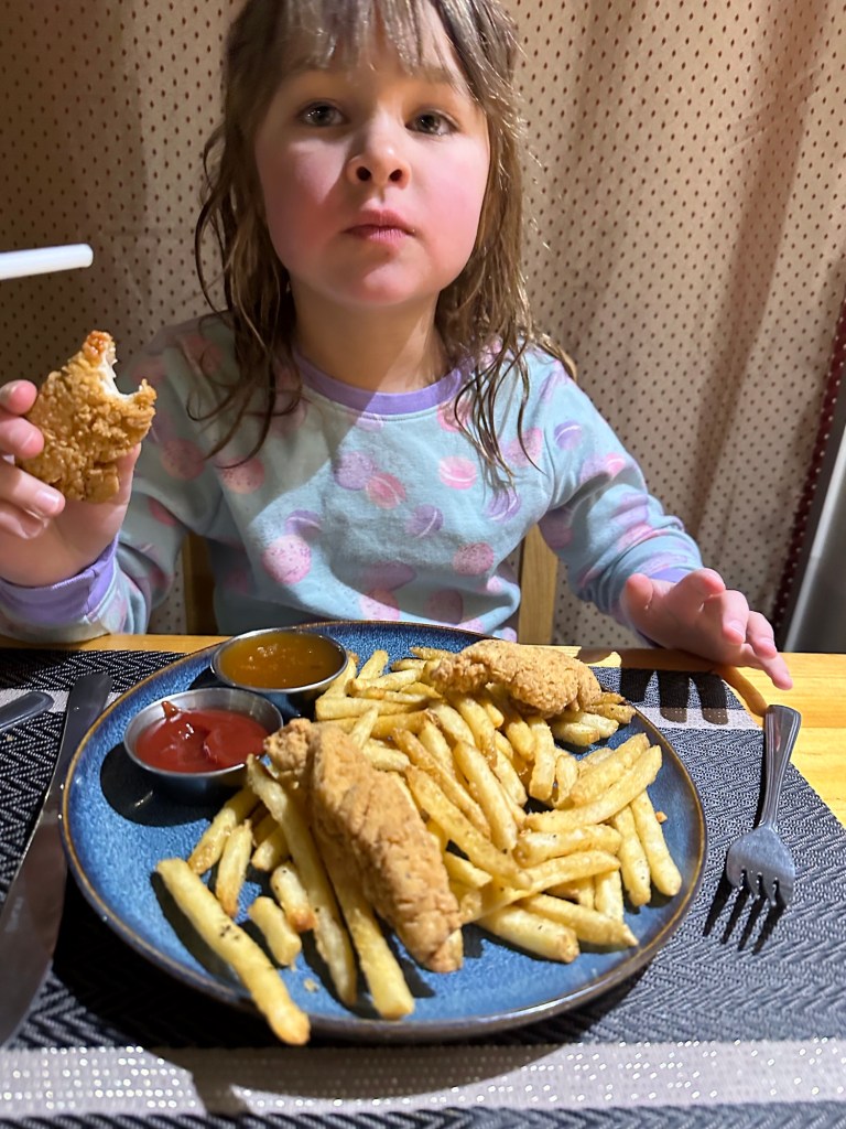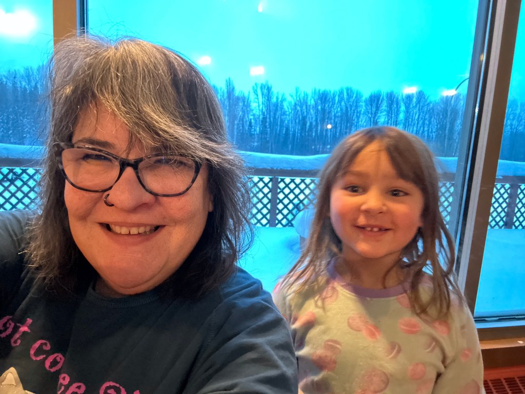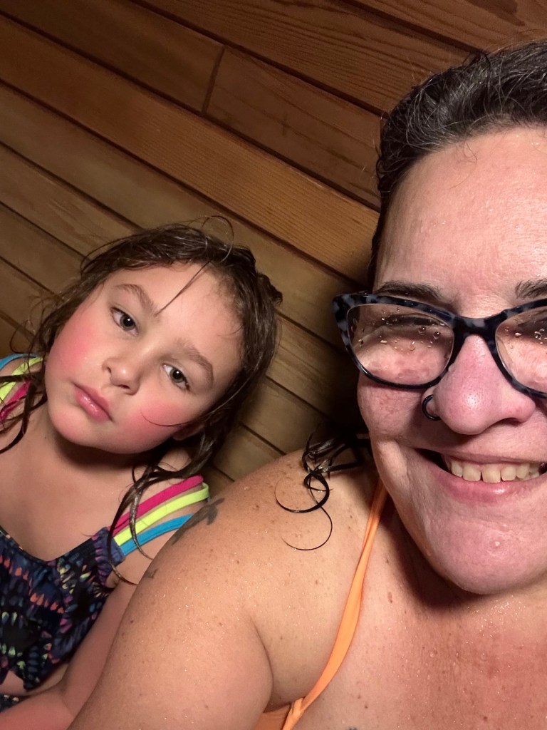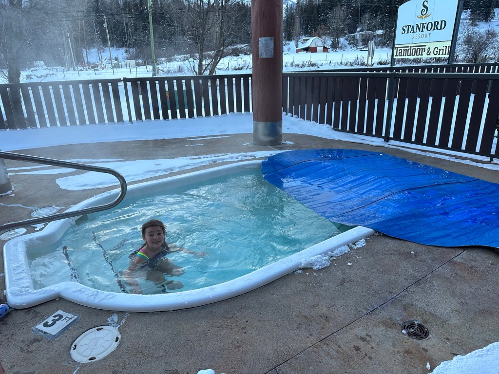Back to the room we went to get into our bathing suits. Emmy had the idea that because we both had new ones I should change in the bathroom while she changed near her bed and then we would have the big reveal. She was so sweet and complimentary about mine and she was cute as a button in hers. We went and spent an hour and half in the pool and for all but 15 minutes of it we had the entire place to ourselves. We went on the water slide, had swimming games and challenges, and even went out for a hot tub in the cold. We both made the mistake of touching the metal railing and our fingers stung for a bit. I showed her how to make crazy hairdos by messing it up as it froze. She told me it was a little bit hard to tell if mine was frosty as it was already a lot white. We then rushed back in to get in the pool for a bit longer before hitting the Sauna. It wasn’t warm enough so it was back to the room for hot showers. Ms E went first and left the shower on for me to get in. She had put the plug in and turned it to full hot, the little monkey. After the showers she did say that my hair is mostly white only on top and mostly dark everywhere else. She must have decided that needed clarifying.