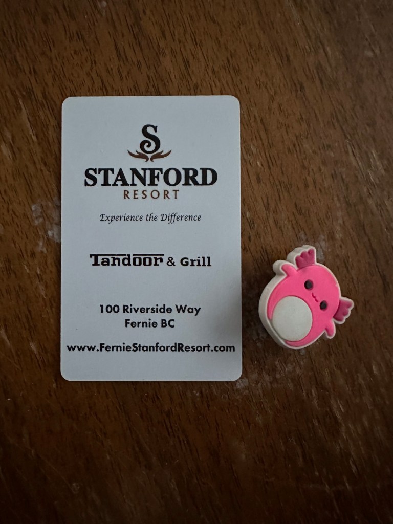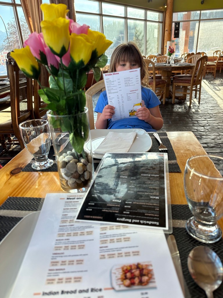 I met Malcolm and Emmy at Canadian Tire and after a short time there we went to the grocery store for snacks and switched Emmy and her gear into my car. We checked into the Stanford Resort at 2:30, unpacked and explored the resort. We did have a good laugh when we found the star from her nose on the bottom of my boot. She had lost it when we left the grocery store. We spent some loonies and twoonies in the game room, and enjoyed appetizers in the Tandoor Grill. Emmy is quite the little observational kid. She is so much beyond her 6 years and we had some great conversations. She was entranced by the restaurant, choosing our table based on the flowers. When it wobbled, we were pleased that the server offered us a private table and even swapped the flowers just for Emmy. She had her first Shirley Temple drink and loved it.
