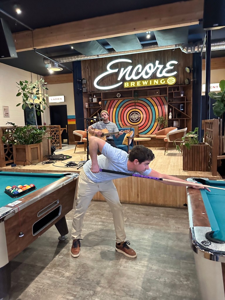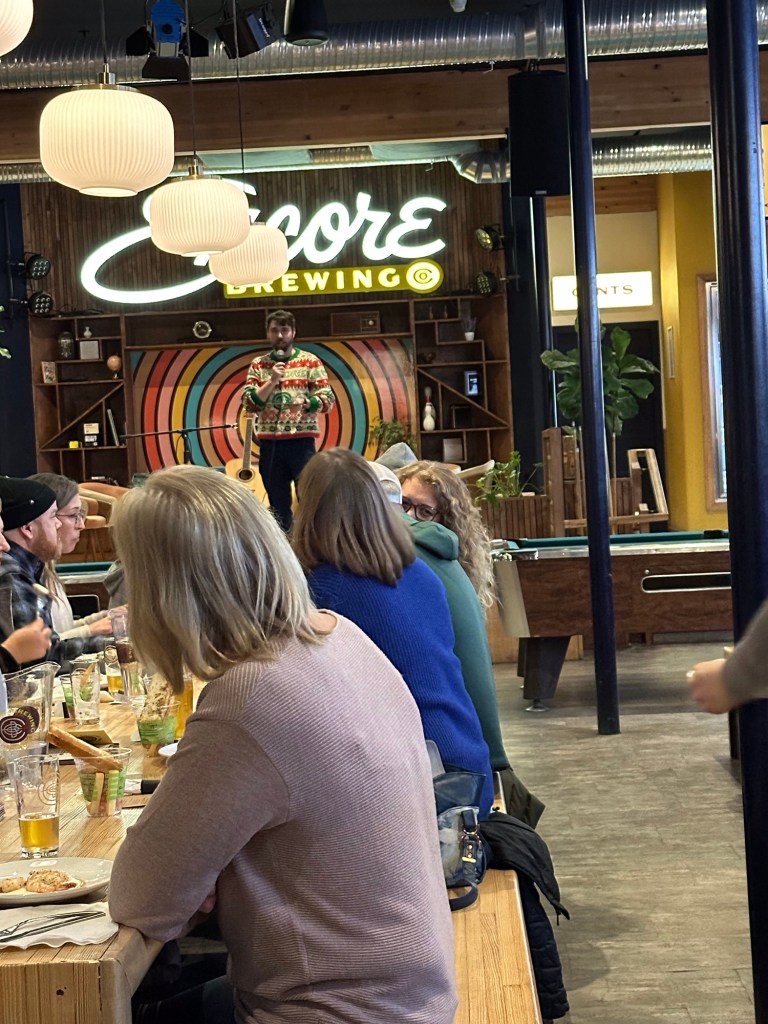 The whole event was wonderful, full course meal with beer pairings. There was so much beer that I had to say no and ended up bringing one of the courses home for lunch tomorrow. The dessert was funny, as poor Doug, the chef, put it, he individually poached and processed each fruit and ended up with a middle to low class 70s dessert that tasted like it came out of a can. Dawson Rutledge from Half Spent played guitar for entertainment and he was a good soul who didn’t mind the pool players and noise.