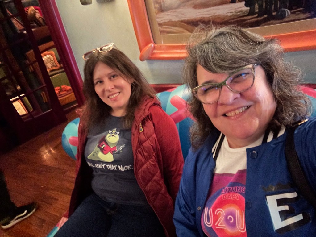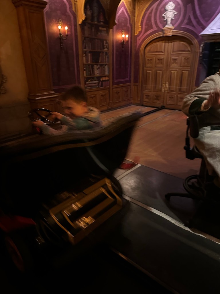 Then it was off to Mr Toad’s Wild Ride. That adventure began back in 1990 when my brother, a couple of uncles, an aunt and a few cousins all joined Ed me in Disney World. My cousin Michael and I rode what we considered to be the cheesiest ride of all and ended up doing it o er and over, laughing our faces off and acting up. I had to introduce the boys to the fun and I sent pics to Michael.