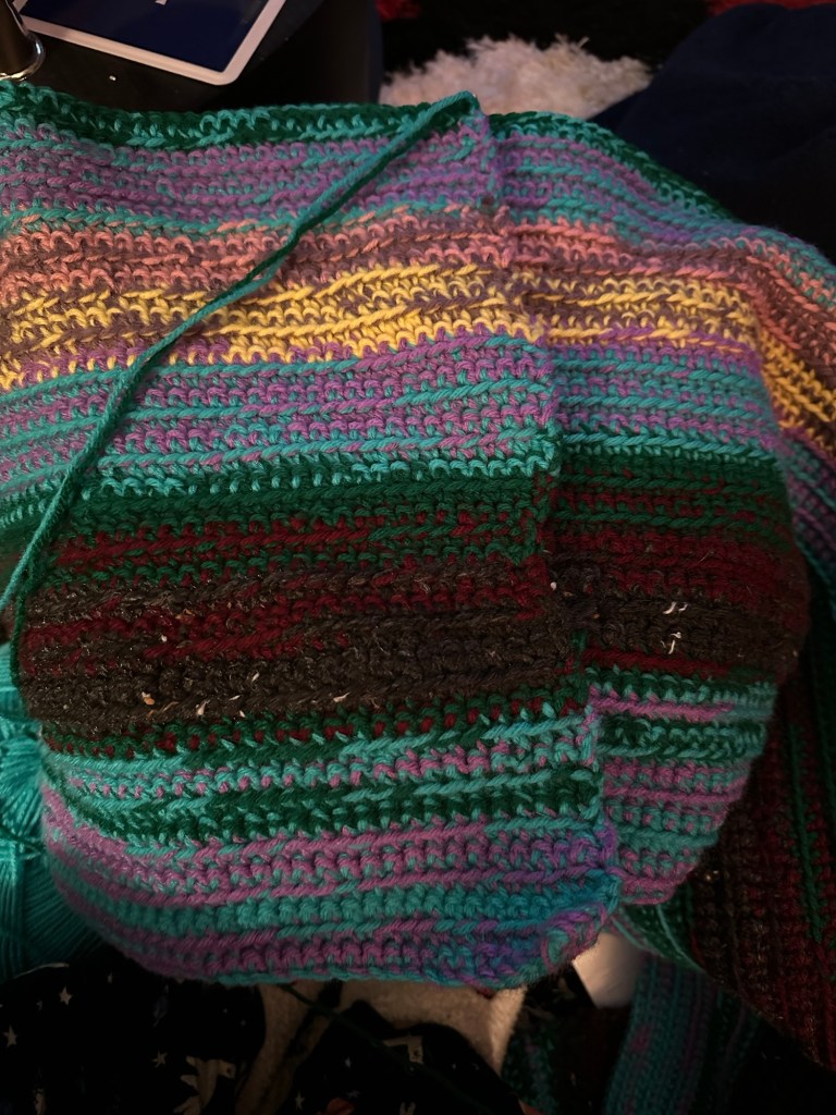 I tried to sleep late as I didn’t get to sleep until wee hours, but was up at a fairly early time. I stripped the bed, got laundry done and crocheted all day to get up to current on my temperature blanket. Each row is the high and low corresponding colour together. This year to date ranges from minus 36 to plus 27 as I am counting where I am at any given time and using a particular website to get the high and lows. I chose to use actual temp but the feels like was even more extreme.