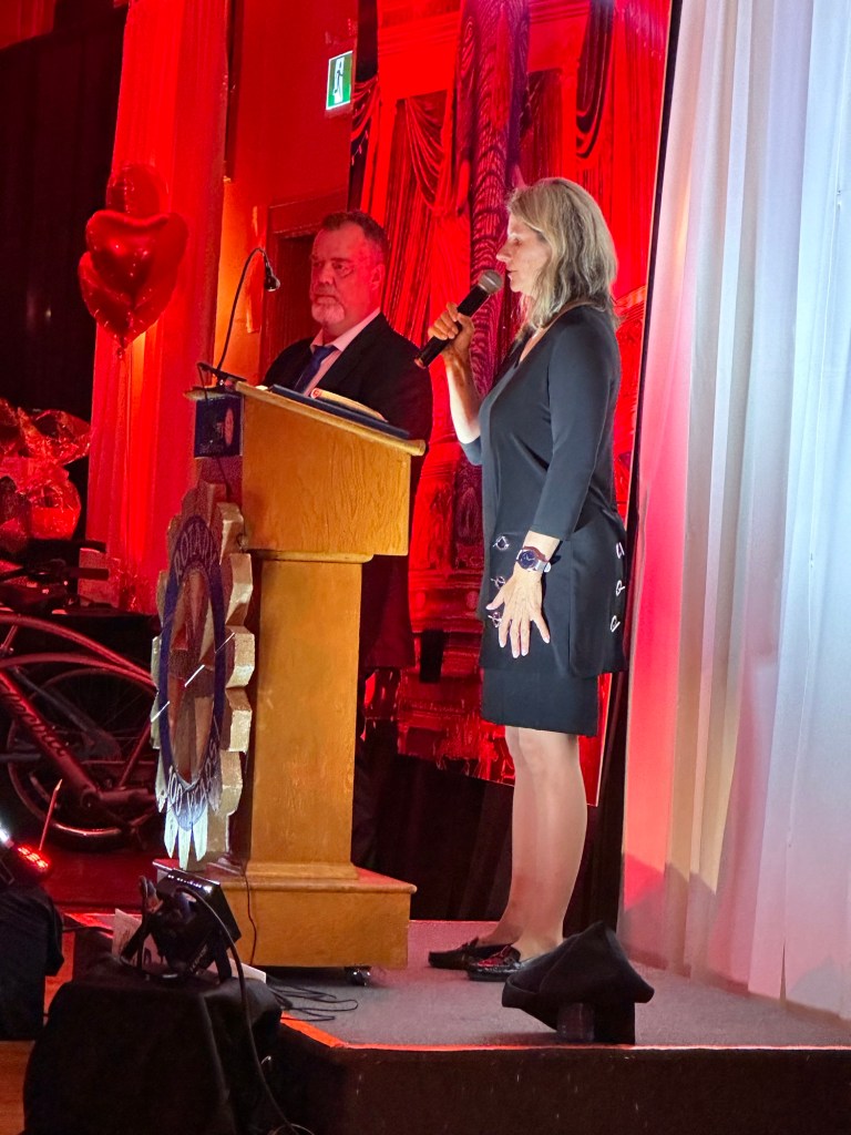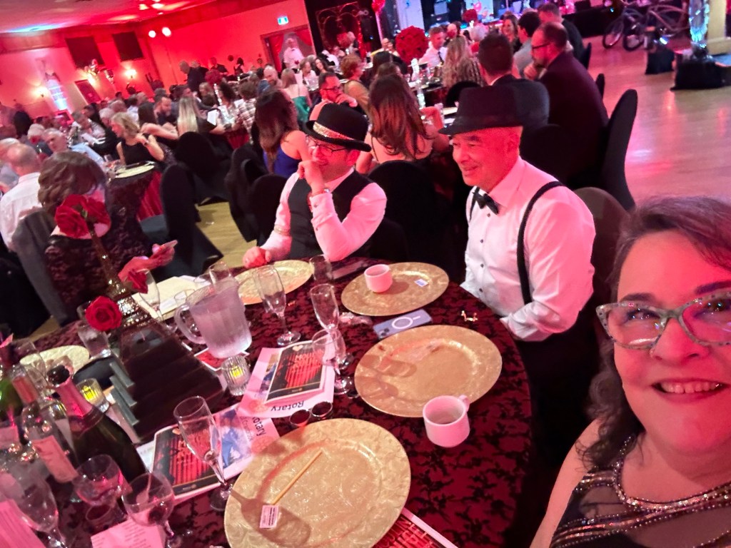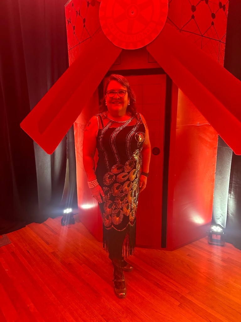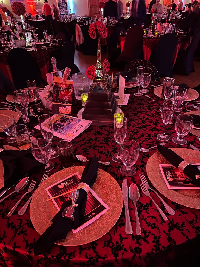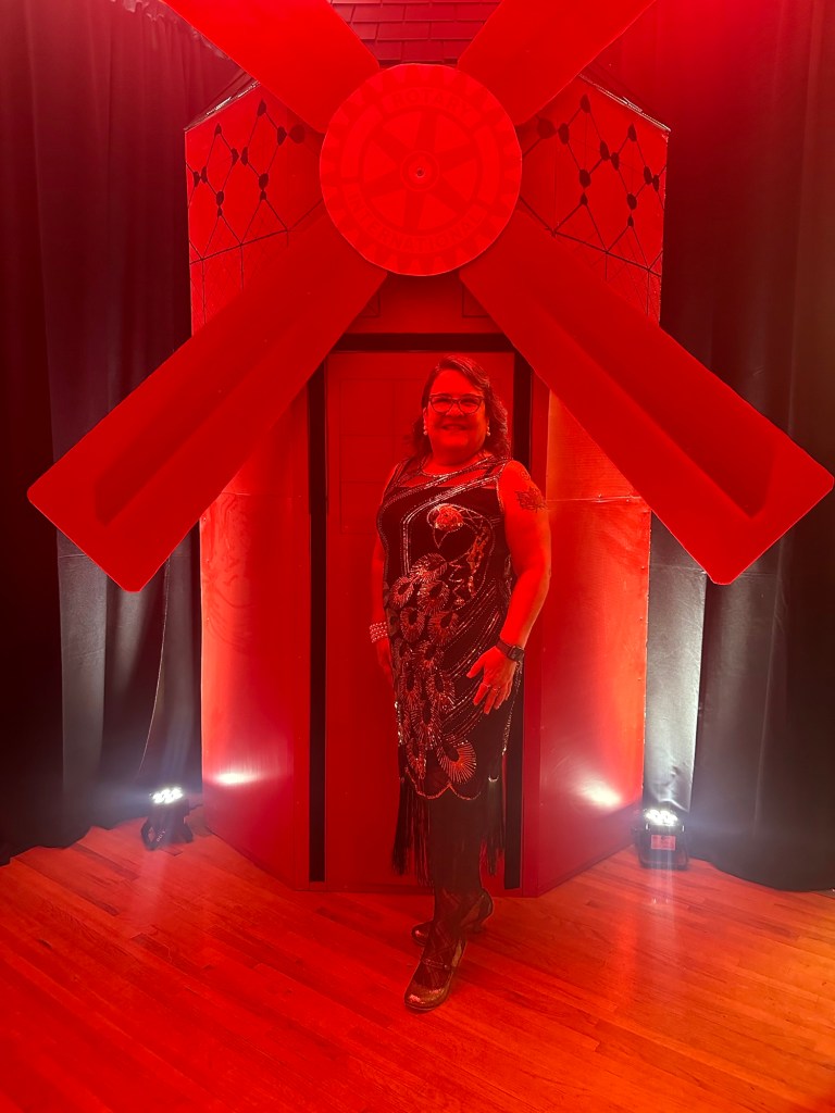 I crocheted and relaxed and binged Severance until it was time to get ready and be at the Colombo Lodge for 4:45. Tonight was our amazing Rotary Gala with a Moulin Rouge theme. It was breathtakingly beautiful. The decor and st up crew did an amazing job. The food was perfection and being the ninth at a table of new Rotary friends made my night.