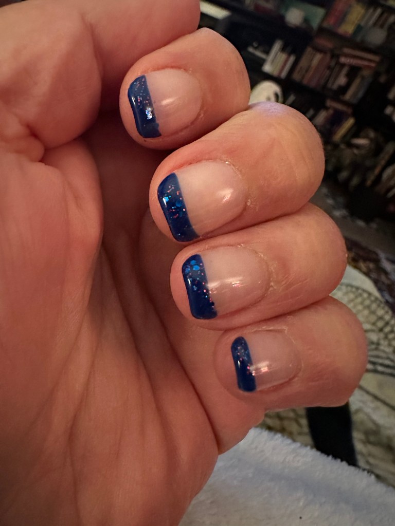 That I picked up Rotary donations, meds, groceries for Mom and did other chores as well as worked. I did make time for fixing my nails as one has been broken for days, and going to the dentist. I have been grinding again so made an appointment in May to get fitted for a mouth guard. Sigh.
