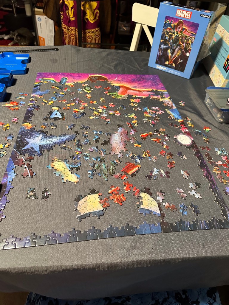 Then I finally got some paid work done before heading to get Mom some groceries and go get the new password into her phone and iPad. Her brother has pneumonia and is unable to help out. I had a quick stop at Encore for a quesadilla and came home to work on my puzzle. It is good and hard, just like my previous Marvel one was.