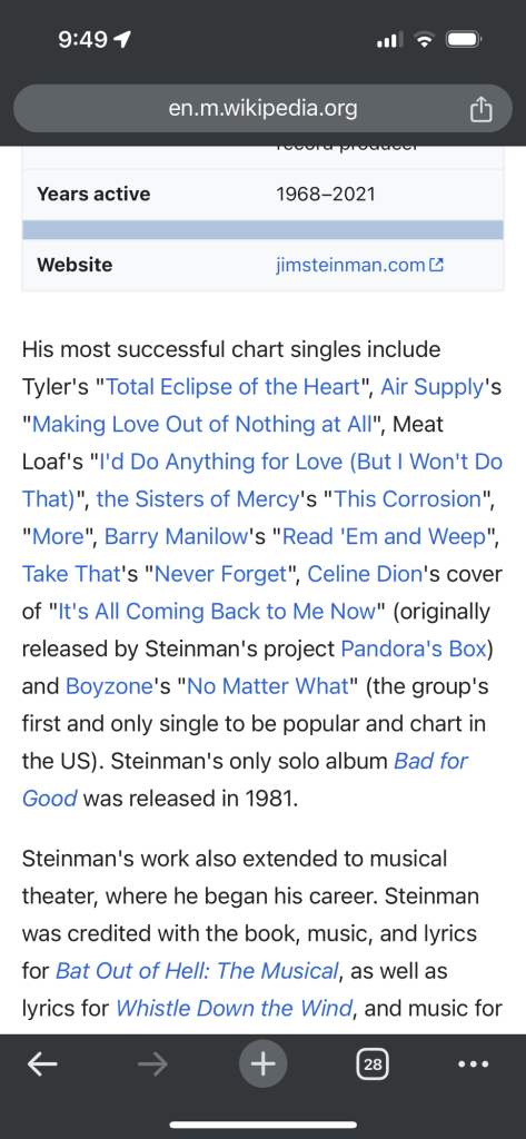 I found out that Bonnie Tyler’s song was written by Jim Steinman. So many similar feels in his songs
