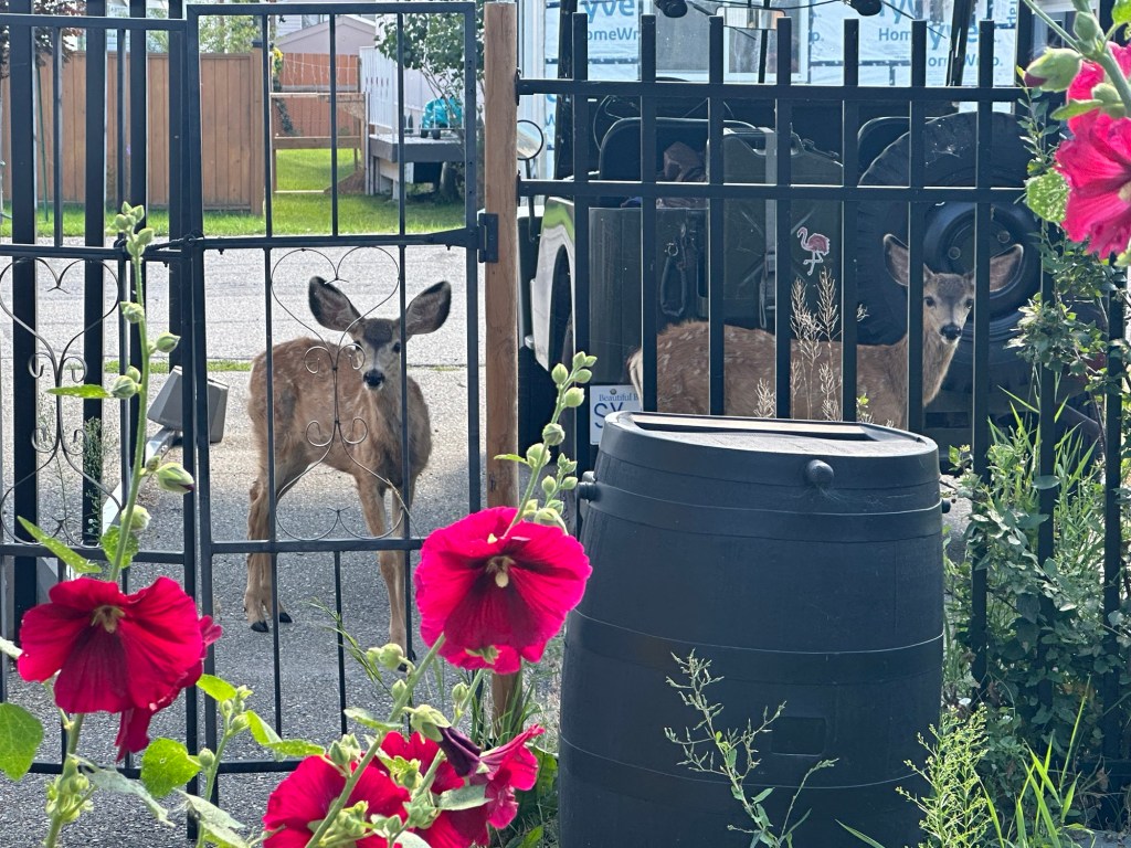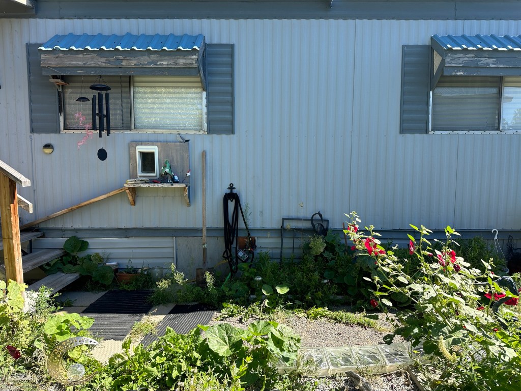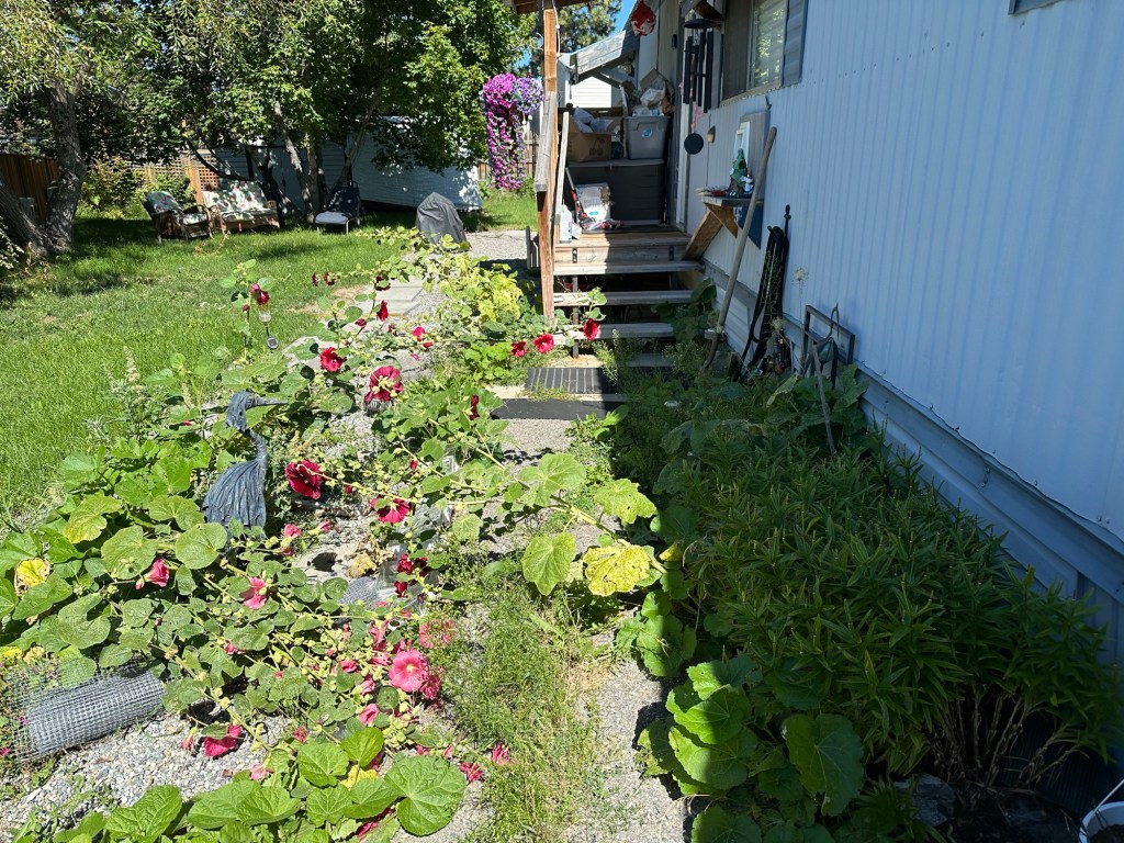 Of course today was the day I planned to work outside. I did trim all my Hollyhocks and trees, dug up all my bulbs in one bed and took the recycle away before I was too hot for me to keep going. I found out that it was one of our dear volunteers that had lost his phone which I had so I dropped it off, and he was very happy. Once home I took a good break in the coolness before going out to build the hutch I bought. I will build a stand and floor and attach it over the cat door to give Missy a critter proof space. It will be interesting to see if she uses it.
