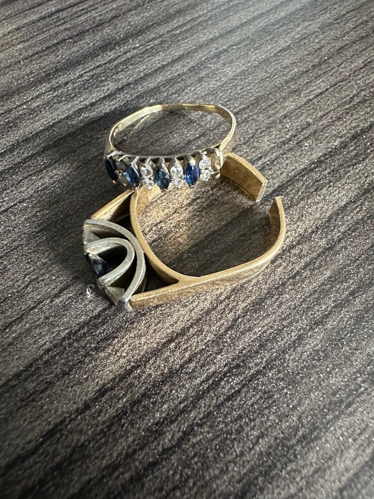 I started the day going to Delamont Jewellers and getting Don to cut my ring off. Two reasons: I have been obsessed about the possibility of getting mugged and losing a finger due to the big one being stuck on, and I need to get a sapphire replaced in the small one that was behind it.