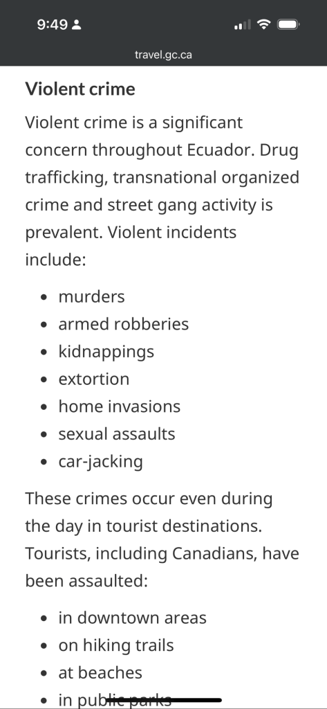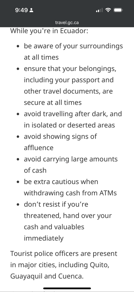 Hard to believe it’s only one week tonight that we land in Quito. I studied on the government site and feel they are common sense