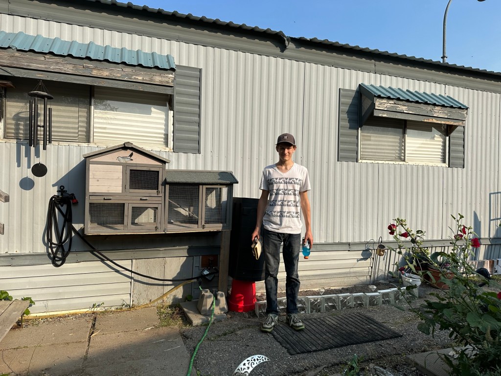 I slept well and connected with Lukas. Picked him up at noon and he came to help me with my make it up as I go project. We needed screws so headed off to drop the recycle, grab screws, and drive thru Wendy’s for a coupon deal. It was actually a really good burger. We mounted the hutch on the wall over the cat door and put the last of my bathroom flooring in it. It is a bit Mickey Mouse but if she gets used to it, will be perfect. I mowed the lawn as Lukas moved around furniture etc. we were all done and he was dropped off by 5:30.