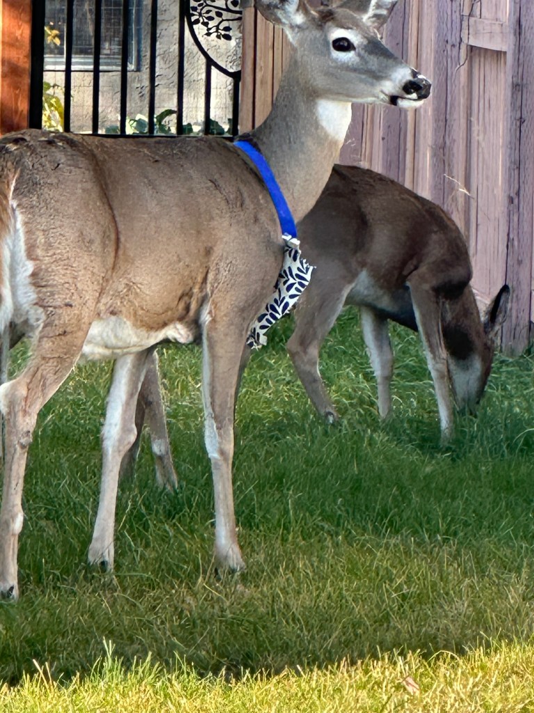 There was a deer crossing my path that headed into a yard down the street. Poor thing was decorated