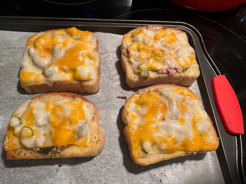 Got home after 7, had a quick visit with Tracey and then made nummy tuna melts on garlic toast for dinner.