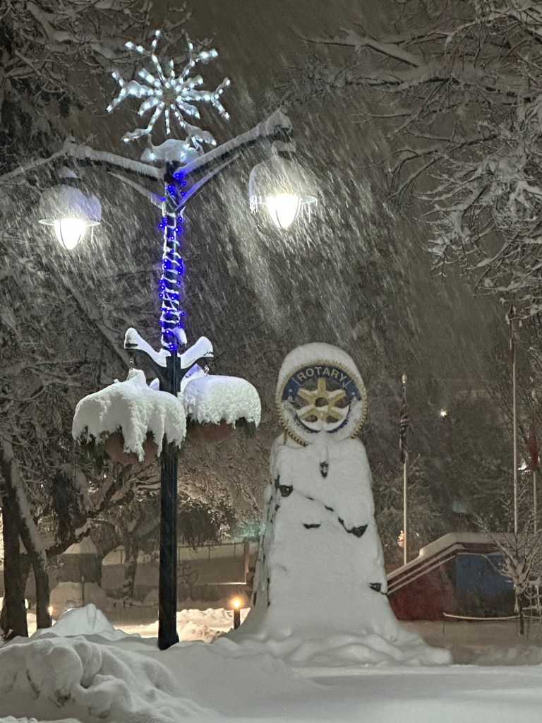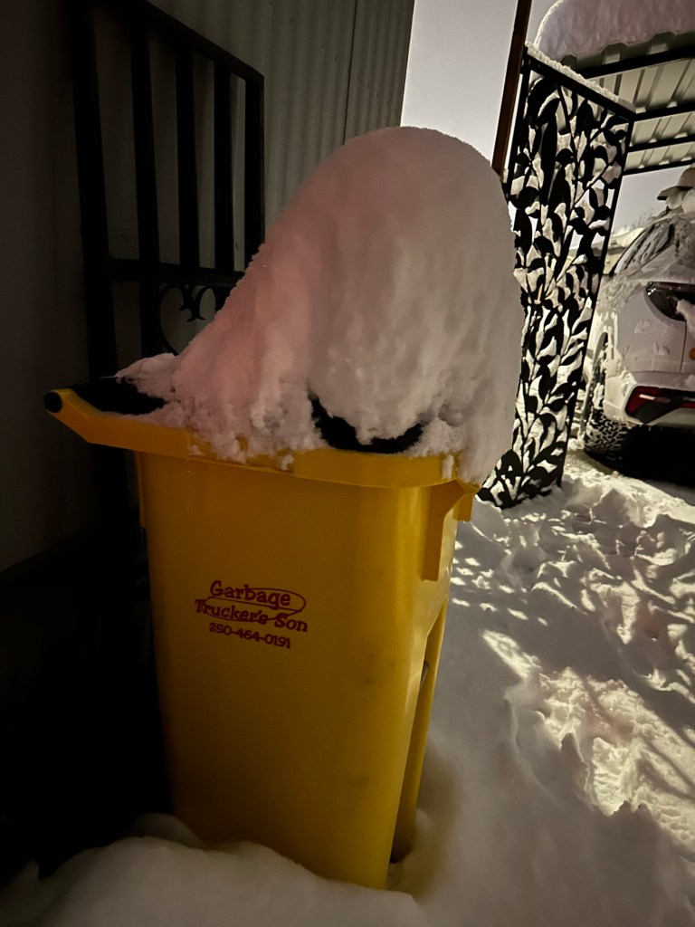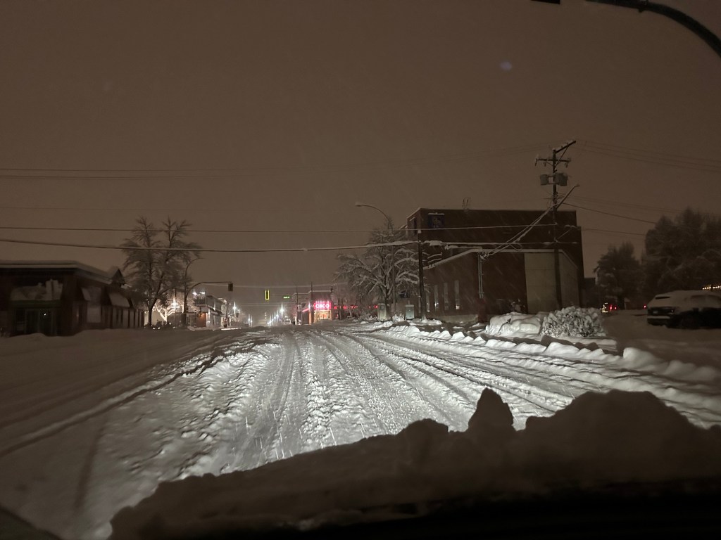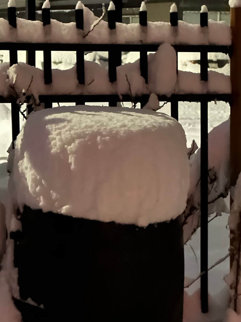 Shovelling three times today was not on my schedule. Work was good, met Rae at her place and we walked downtown for the annual late night shopping. It was lovely to wander in and out of stores who had snacks and bevies for us as well as deals. Roger picked us up to bring me back to my car in time to drop my stuff at home and head to Galen’s for poker night. I came out $75 ahead after taking 2nd place. Kathy and I were just going head to head when the power went out. I drove around for a bit after and there were odd parts of town in the dark. Even a block from me is dark but home is fine. It sure is beautiful but what a dump and it is still coming down heavy.