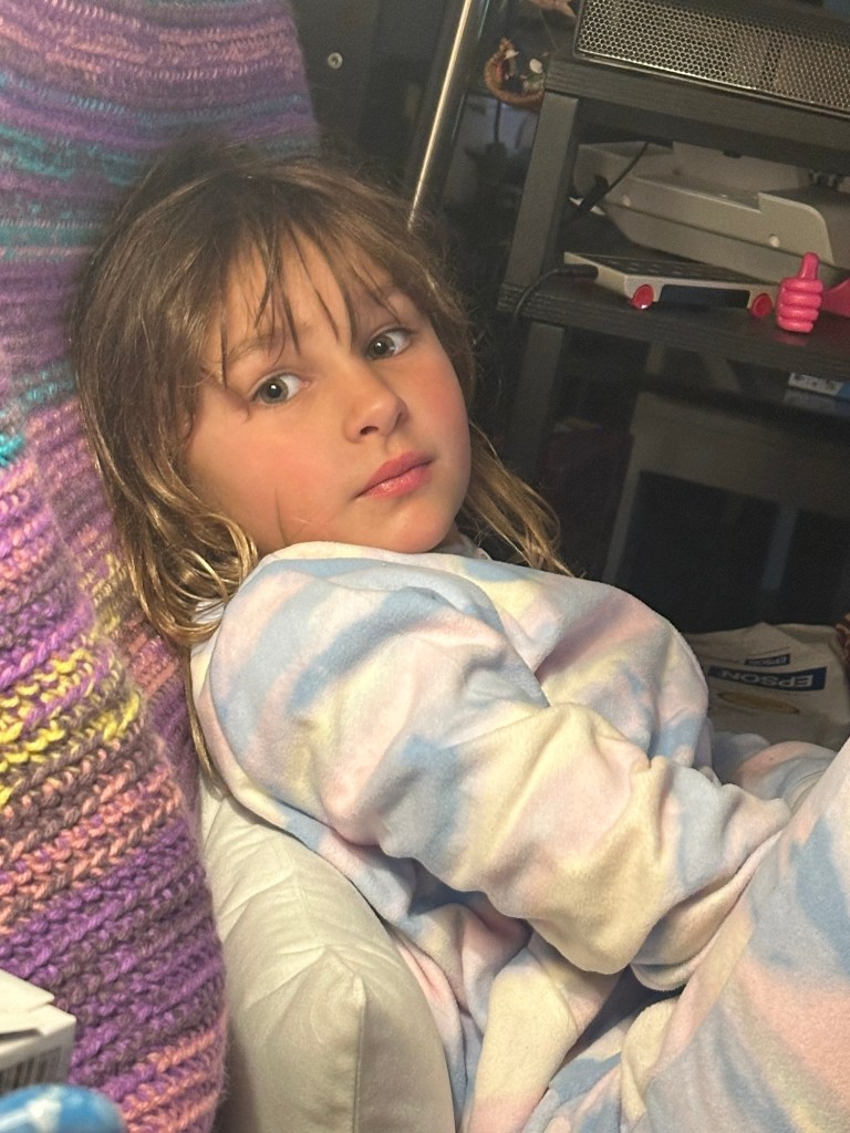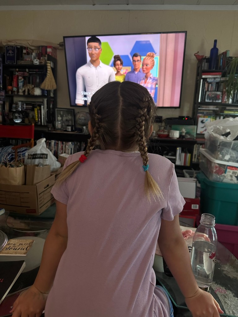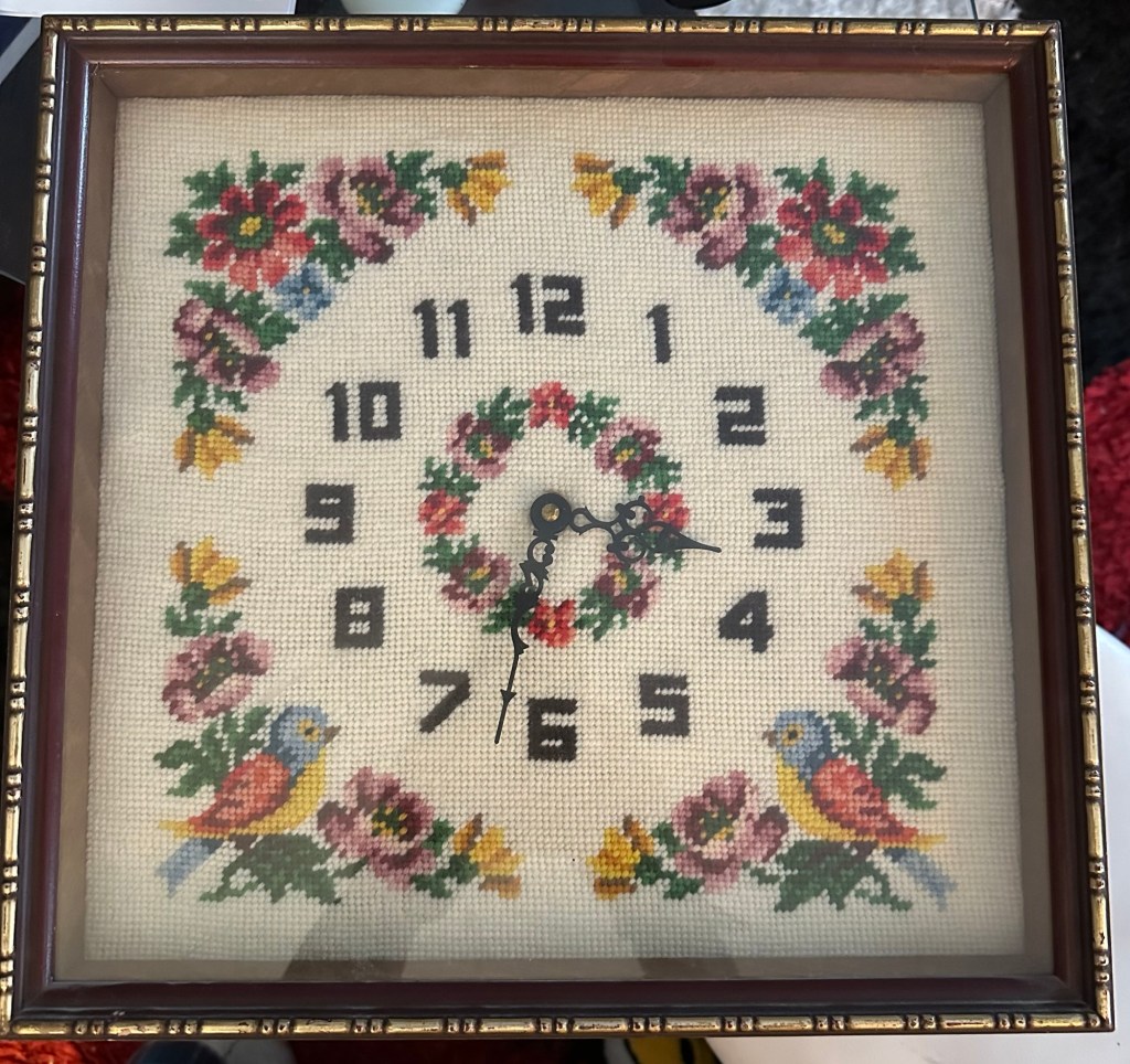 Emmy and I had a perfectly lovely morning enjoying scrambled eggs as we watched some animated shows involving Minions and then Barbie. I French braided her hair and impressed her Mom when she came to get her. I gave Danika my set of Royal Dalton Bunnykins china and the needlepoint clock that my Nana made in the 70s. I appreciate that she likes and values vintage items.