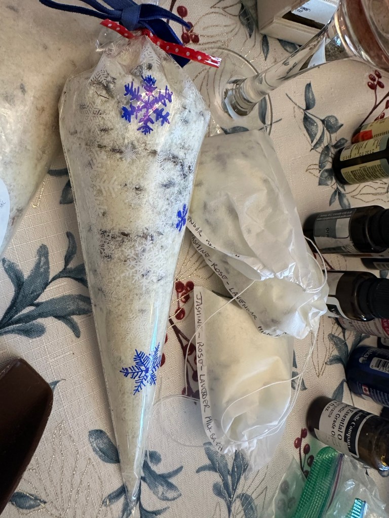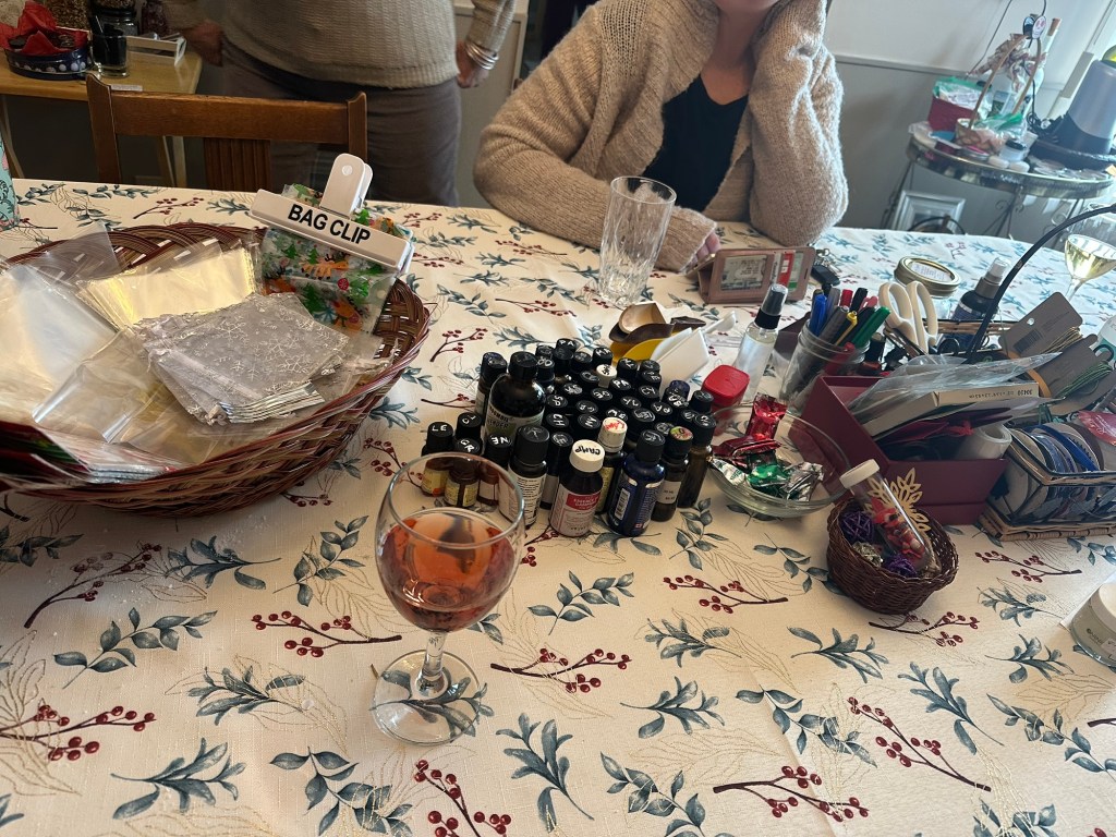 Got ready and picked up Monica to go to Verna’s for a crafty afternoon. I made bath salts, lip balm and gentleman’s scented oils. It was so enjoyable and I am always grateful how welcomed I am there.