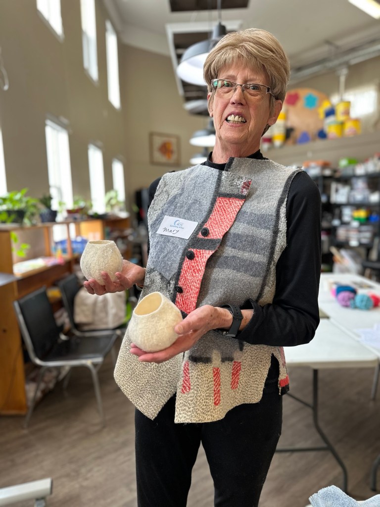 One of the demonstrators was Mary who does wet felting and I was so traced by her tea light holders that she made that I wanted to buy them, but she wasn’t selling them and I said, but if you were to make a couple that I could buy from you I would I would buy them and she just gave me two of them. Although I may be spoiling the surprise, my plan is to send one of them off to my friend Linda in England and then we can both have a beautiful piece of art and think of each other when they’re lit up. it is so lightweight and I can flatten it and mail easily. Mary even did a little video for me telling how to Restore it once it gets there.
