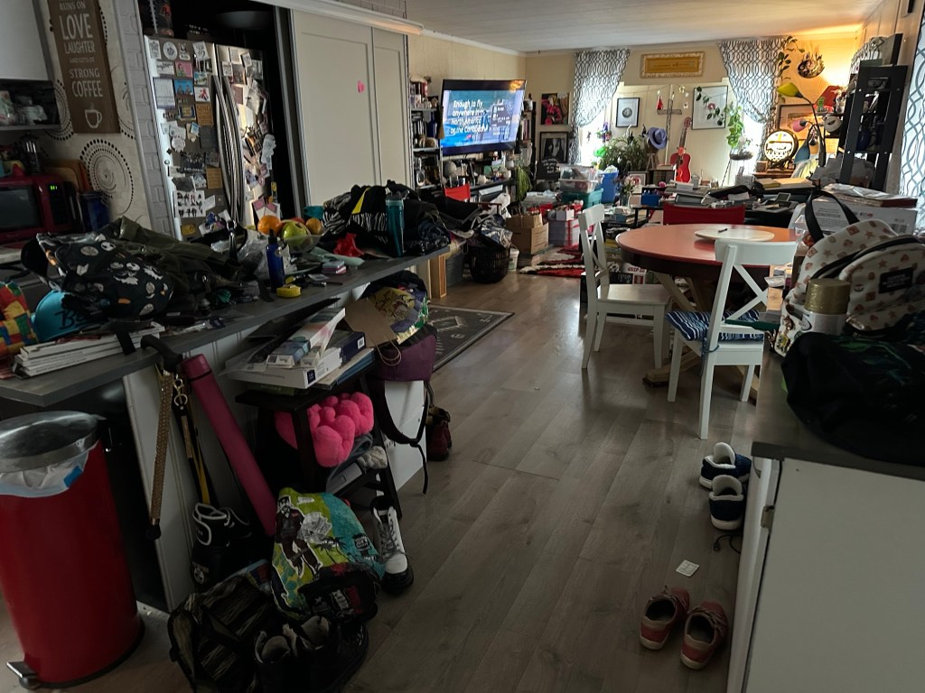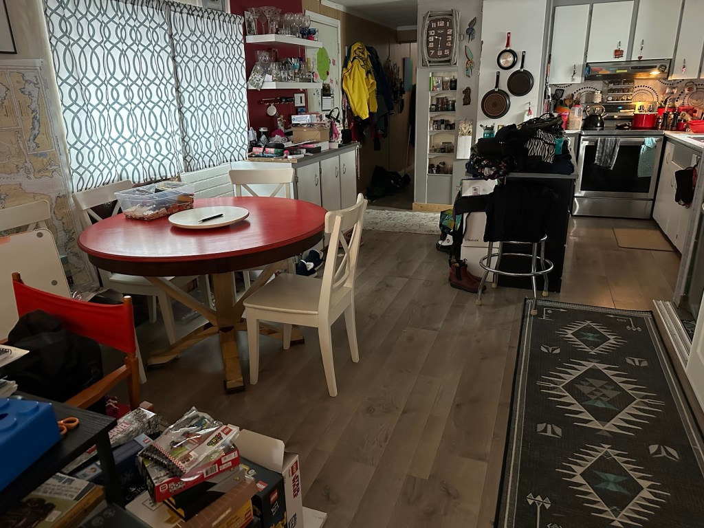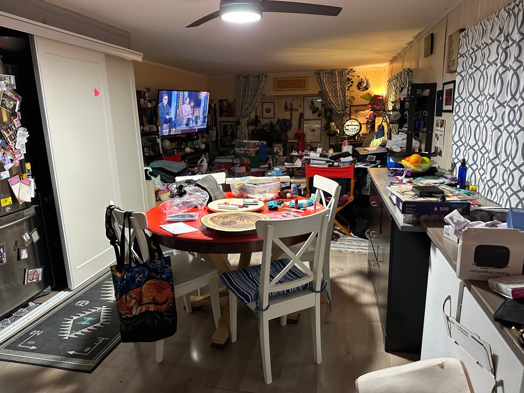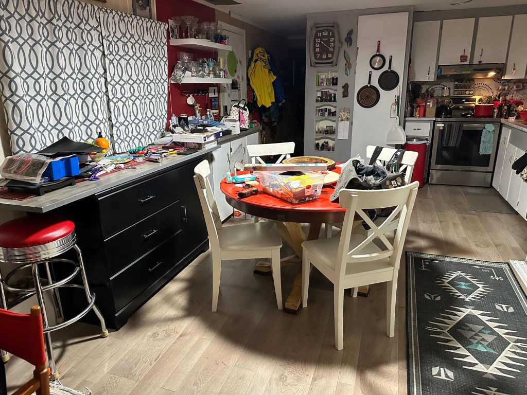 I had an idea to move my island against the wall, where the cat door is, and the wall is unfinished, and the wind blows in and have my table more out in the middle and accessible and just have a change so I did that and I started sorting all the stuff that’s piled everywhere. I didn’t get it all done, but I got quite a bit done And that makes me happy.