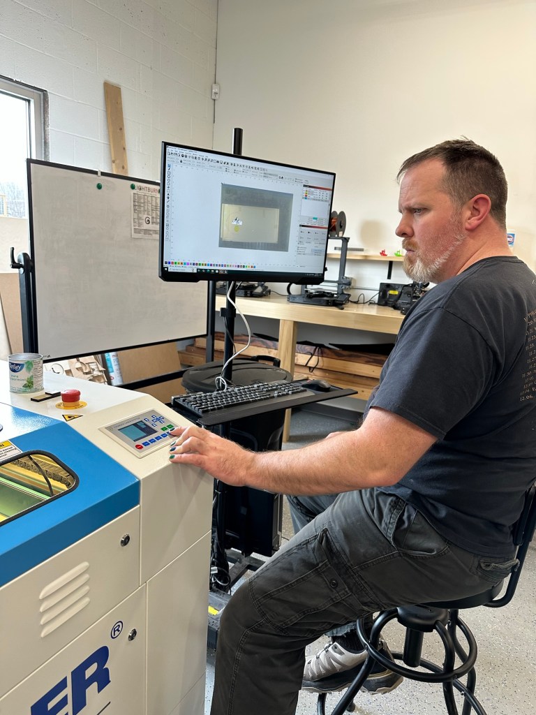 I went to the office to meet Chris from Murray Technical Excellence who was going to help me do the crib board that I want to offer for the Rotary auction. He was held up for about an hour, which actually worked out well because I got the filing done that has needed to happen for a year. When he did arrive, I took apart the Lazy Susan that I had bought and we made a template. It was probably a four hour adventure by the time I was said and done because I had to stay there while it was being processed by the laser It sure beats the heck out of using an old woodburning kit though lol