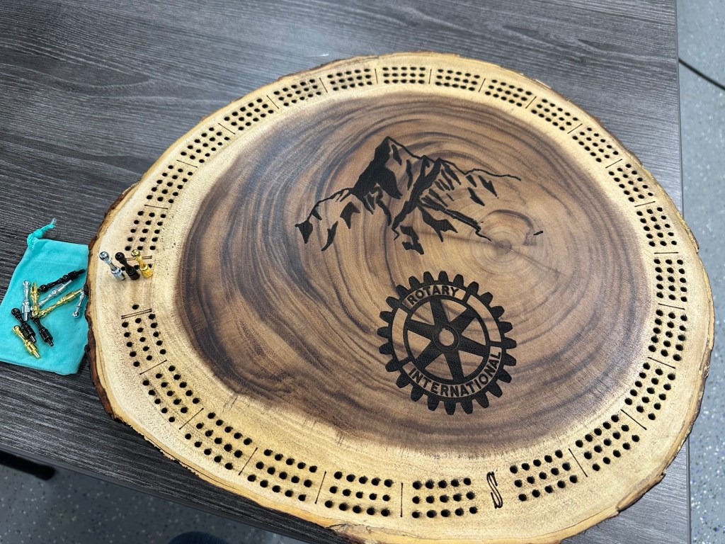 It really did turn out beautiful. We both realized once it was fully done after so much attention to detail on the whole size etc. that the Rotary logo is not perfectly circular, but it’s still so gorgeous that I am very happy to donate it in both our names to the auction.