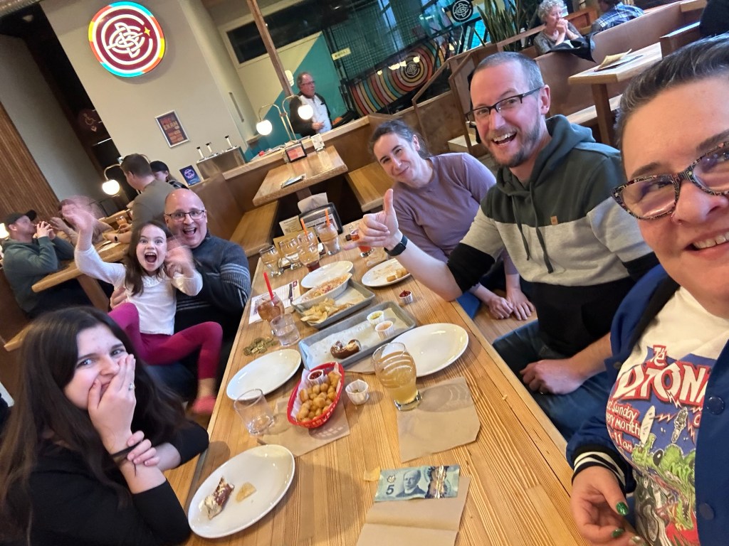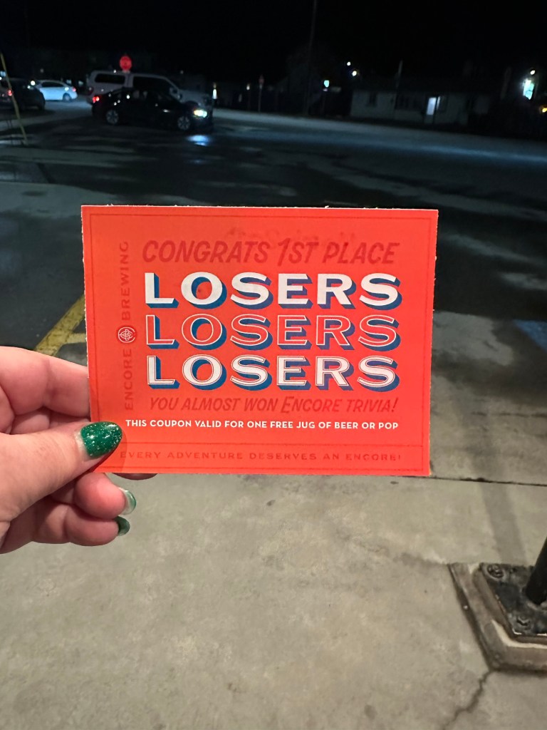 Seriously, today was a very good day. I had Rotary lunch with interesting presentation by the wife of one of my previous clients who I’ve never met before and then it was meet with two different clients over the afternoon who are powerful women that I enjoy the energy from before heading to Encore For trivia night. On the way, I stopped at fire hall to pick up the swag that was donated to Rotary to find out that my entire trivia team was there for the top takeover. I stayed long enough to have three samplers with paired beer that were delicious from Nelson brewing Company, and then I had it off to Encore to find a team for trivia to join as I had cleared my schedule to do that tonight. It turns out that my friend Sean and his daughter Zoe were here from Vancouver Island and we’re having dinner with Brett and Jill and their two girls Morgan and Riley. I asked her if they would like to form a team and they were into it and I’m not gonna lie. We had so much fun. We tied for a first place with the usual team and Sean went up as our person for the music tiebreaker. My heart was broken when the other guy answered first on the U2 song to win.!