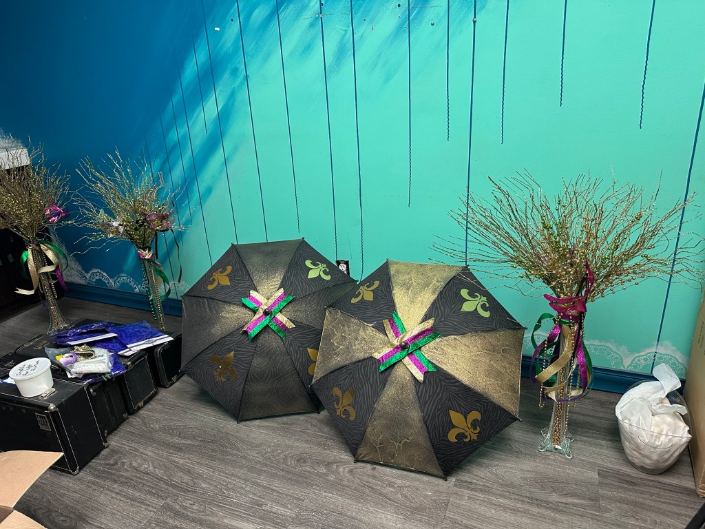 Today was kind of lovely. I headed off to the Groundfloor to spray paint the last umbrella for Rotary so that I could add fleur-de-lis and bring them to the decor meeting at three.