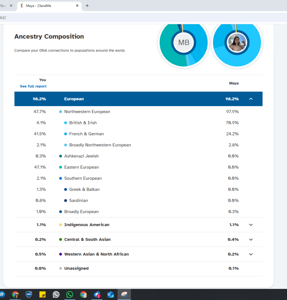 A cool thing today happened when I went to download the data and delete my 23andMe account. It turns out that my brother‘s daughter, Maya had her results on there and enabled me to take screenshots of our background to see clearly what part of my DNA is from my mother versus my father. This was the main reason that I wanted to sign up in the first place. So basically all the 0% on Maya side is what comes from my mother. There may be some overlap on the other percentages with my father, but the important stuff is what specifically comes from my mom.