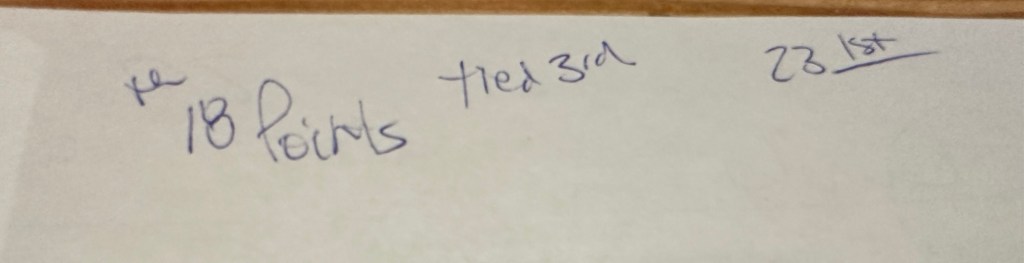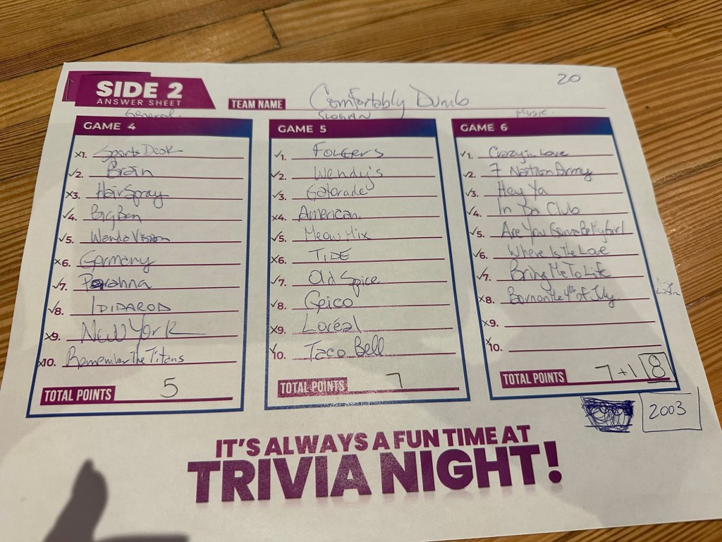 I was so grateful that Brett showed up for trivia night and it was just he and I and we became the team Comfortably Dumb. We did surprisingly amazing for just the two of us coming in tied for third in the first half and then fifth overall behind all the other bigger teams. He already has a plan to bring two guys that I know and I have two women who will start coming in May and I think we’ll have a very well rounded team and I look forward to it but honestly, it was just really fun tonight with he and I.