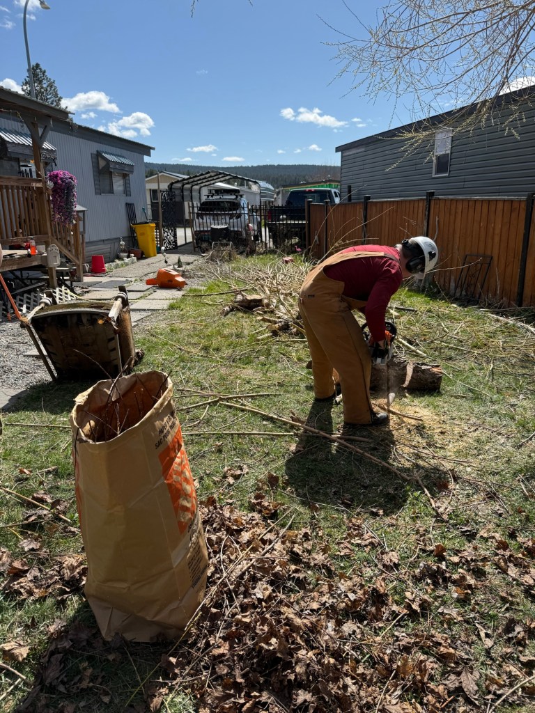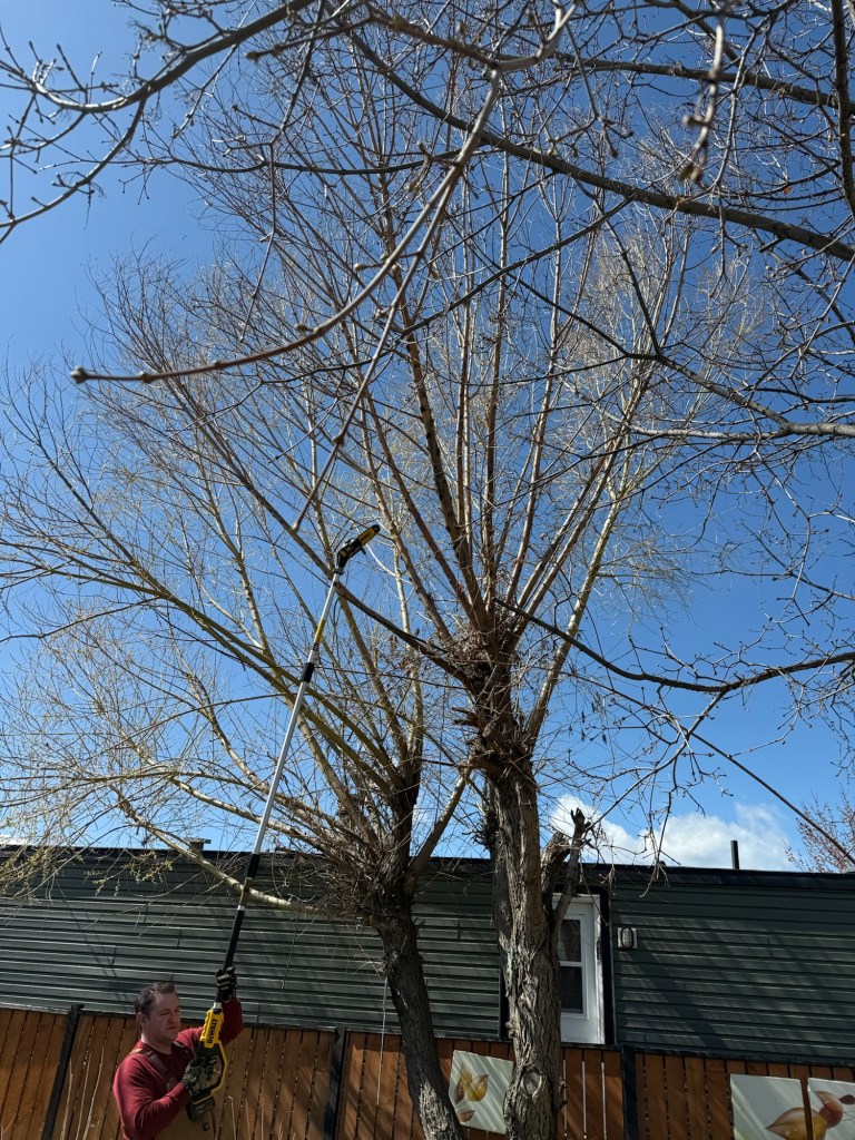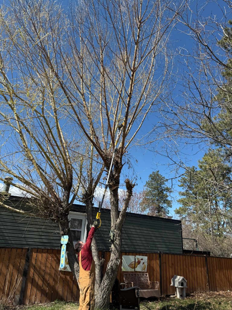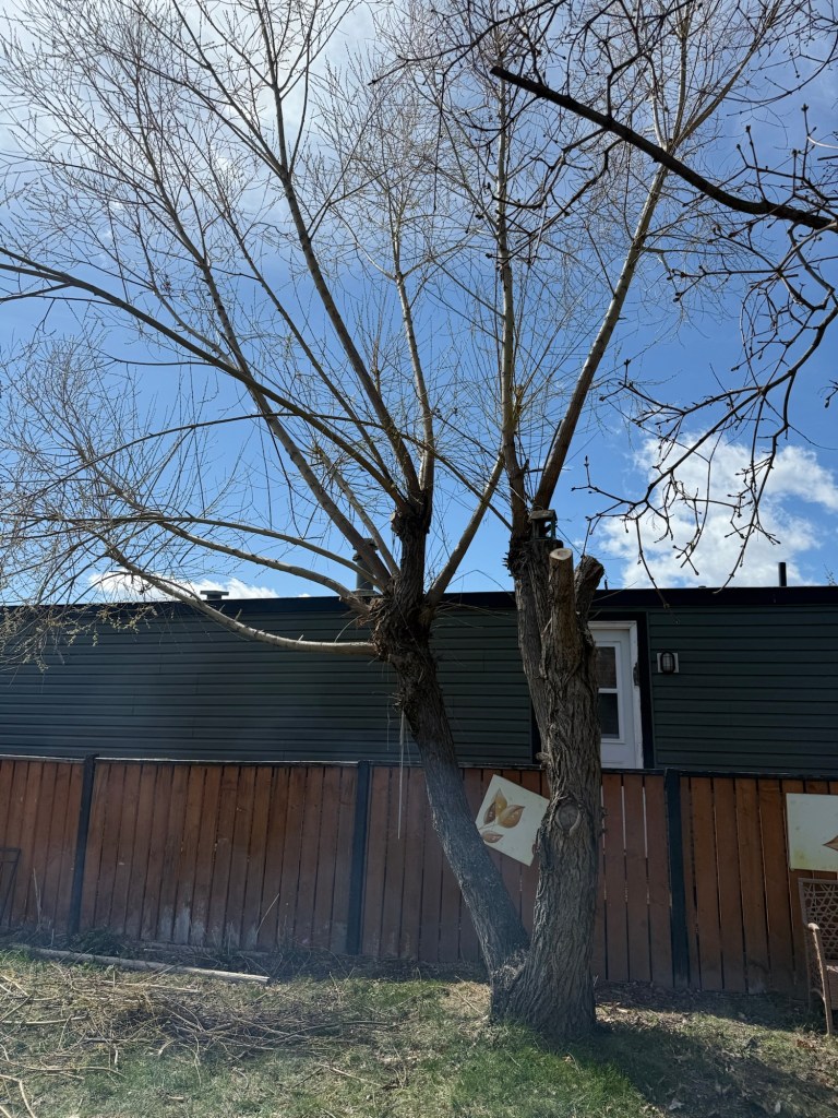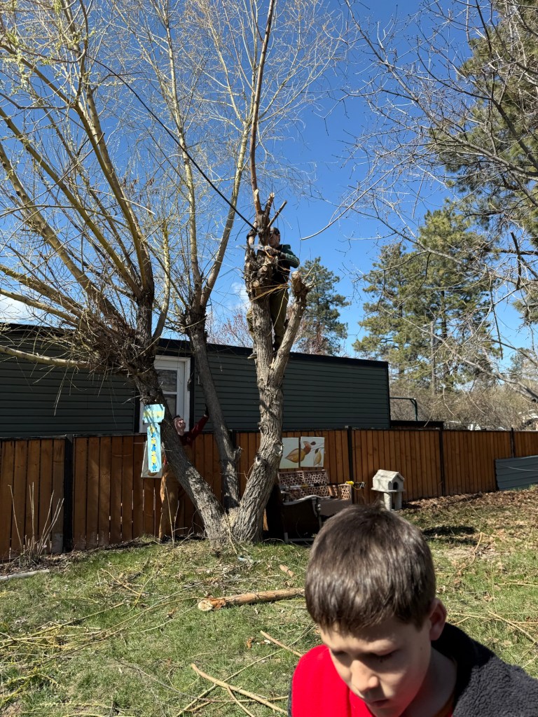 I had a relaxing morning, trying to get my new phone set up mostly and then decide to jump in the shower after lunch. When I got out, I could hear voices and then there was a bang on the door. It was Roger with Lukas and Sawyer here to deal with my willow tree. What a wonderful surprise as I had talked to Roger about it but not made a plan he has this super cool battery operated little chainsaw on the end of a pole that can extend. It was so hard to watch half my tree disappear, but I am hoping that is alive enough that new growth will come out of the parts we left. I did start a fire and started burning off some of the smaller sticks. He took a truckload of the bigger stuff away. And we got to that point just as it was time for me to leave for the arena to do 50-50 for the afternoon hockey game.