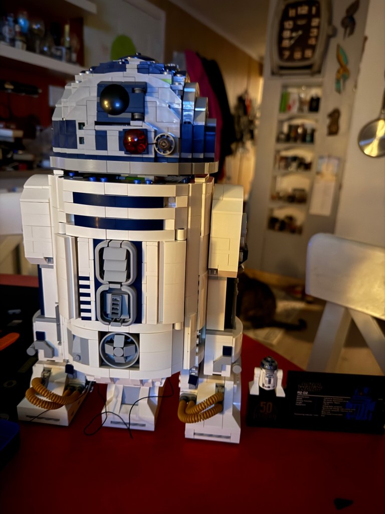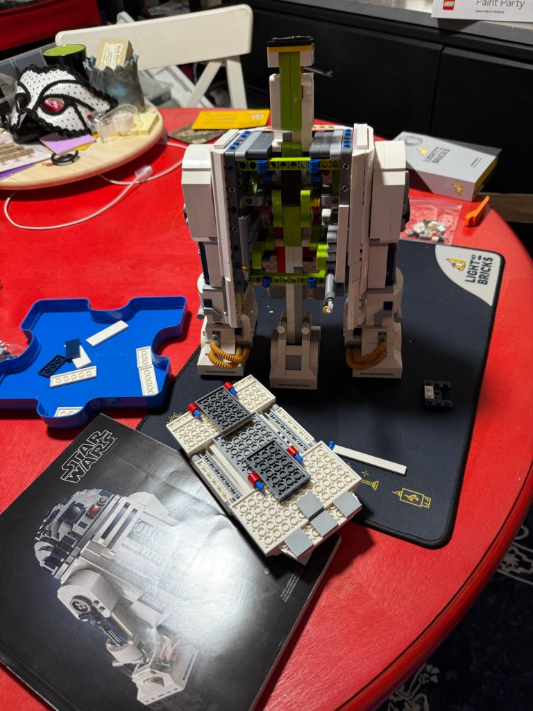 I stopped to make some dinner which was delicious and then continued on. I tested it with the lights and sound and it was incredible and then I undid a wire and it turns out it must’ve been some kind of a ballast because the board started to smoke and only two of the lights come on now. I will have to order a new part, boo. At least it’s all together now and looks great and the sound and lights were pretty fantastic with a remote control that made them flash and change and it made all of the cool droid sounds. I don’t plan to do any more of the older ones with lights. The directions are very unclear, the parts weren’t what was shown in the pictures for the lighting system, etc. so I was just glad that it all worked in the end. It still looks pretty cool for now though so I’ll put it up on my shelf and wait for the part to come.