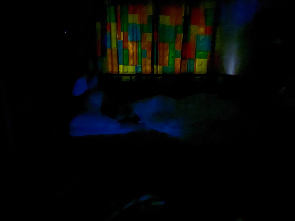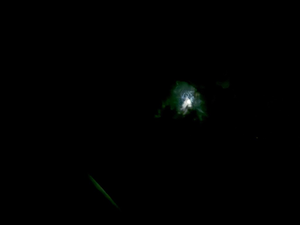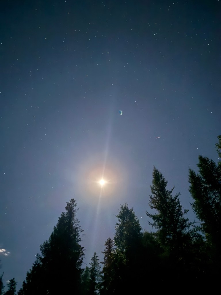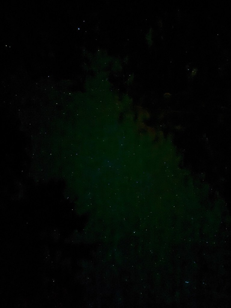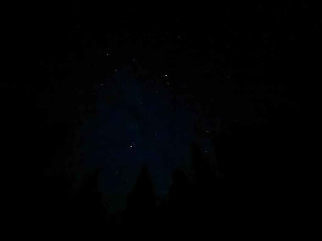 I took a couple pictures in the pitch black before I went to bed last night around 11. One was the circle of my headlamp which resembled a moon. I had a terrible time trying to get to sleep. I didn’t bring my CPAP machine with me. I couldn’t get comfortable, although the mattress was amazing I still found my ankle to be uncomfortable. Once I did get to sleep, I woke up many times in the night and finally at 4:49. I decided I would get up and go to the bathroom before the cold hit and I would have to, and maybe there would still be some of the meteor shower left. As it happens, the moon was making it as bright as morning, and I didn’t even need a flashlight. I took a picture from near the trailer. I was in and one in the exact same spot that I took after the fire at nine; amazing difference.