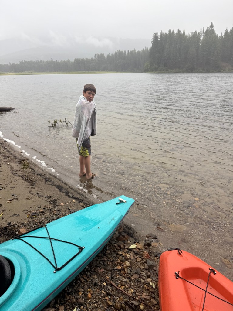 I had a decent sleep, my power pack kept my CPAP going and charged my battery honestly it rained off and on in the night and misted and drizzled throughout the morning. Just before 10 Sawyer and I went for a short swim. As you can tell by the pictures it was comfortable in the water but a bit chilly out