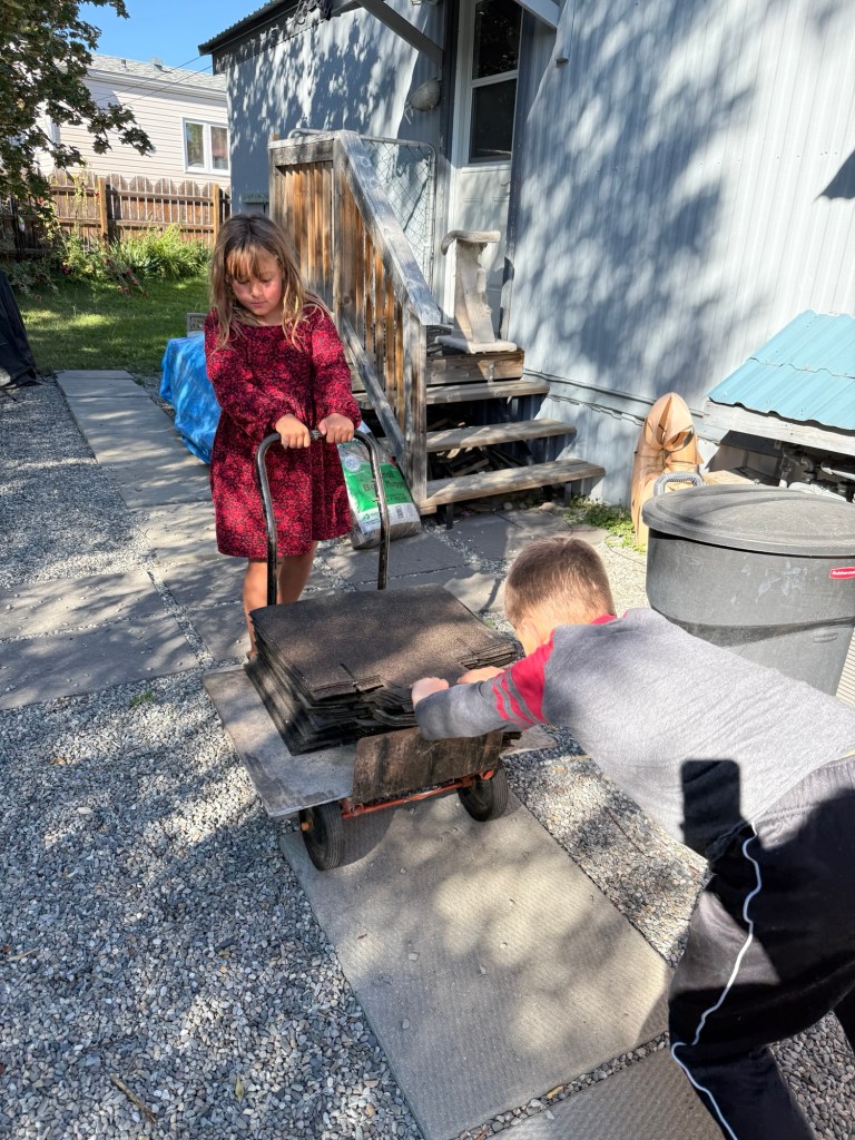 Emmy and Sawyer helped me with the last chore for the day, moving all the shingles that Roger and I scooped from Bills supply out at Moyie. We wagoned them over and put them in the shed until I can get them on it. Both those kids are strong!