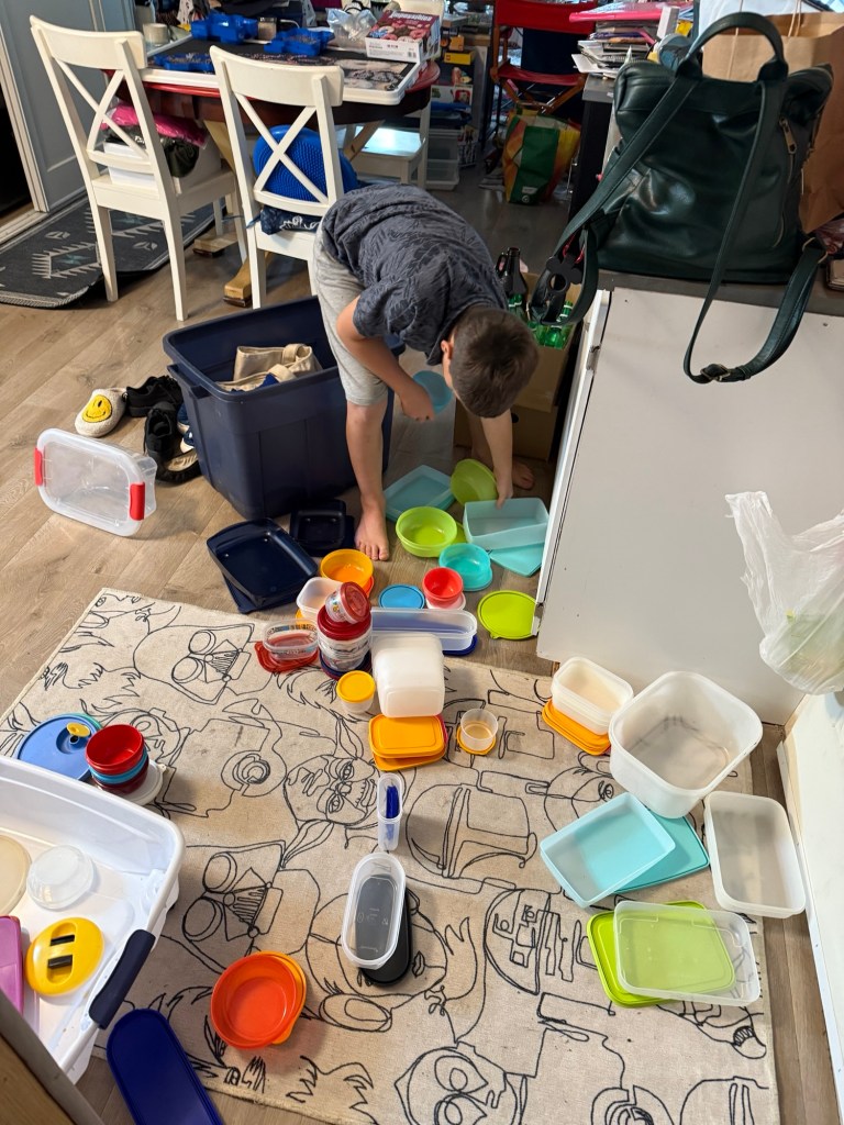 Next, we emptied an entire closet of storage items and sorted all the Tupperware to make sure it had matching lids, etc. Any of the offbrand named items went into the to go box and some set aside to post for sale as they are a little lunch boxes so it is a good time of year to sell them