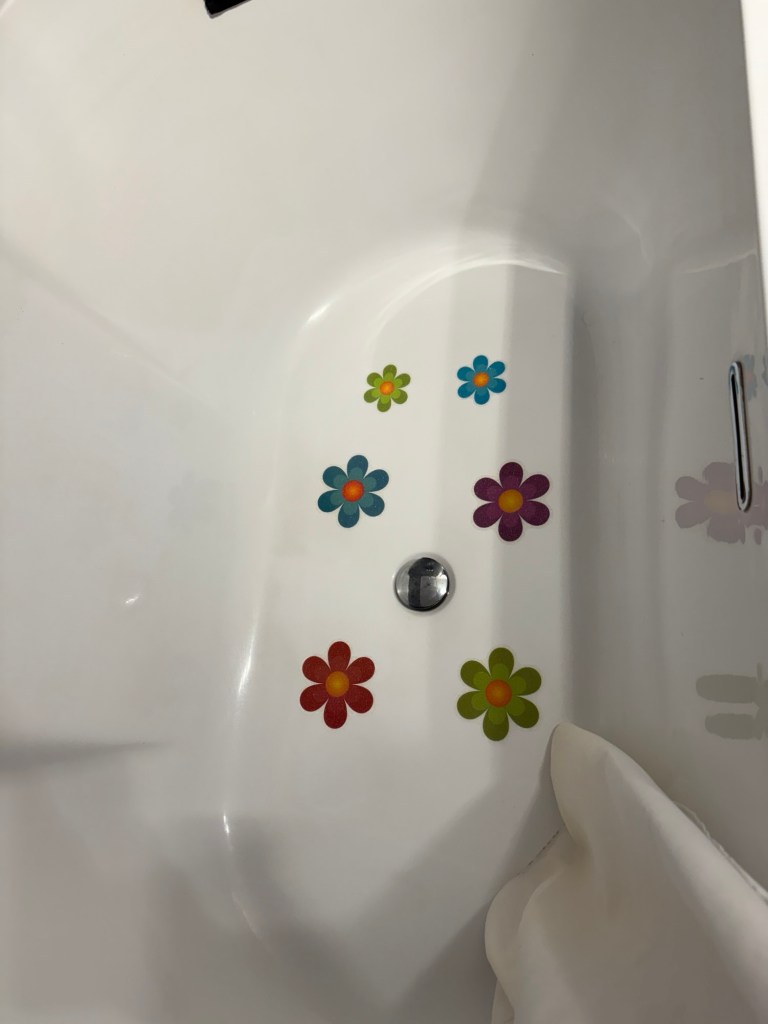 Of course, I said yes, and just adjusted my schedule for the day which had involved going into work. When he arrived, we worked together doing some pretty solid chores. We took out all the garbage, including the litter and seriously clean the litter box and surrounding area. Then he scraped the old non-skid stickers off the bottom of my bathtub I scrubbed and clean the tub, grabbed a shower and then we put the new stickers on. I think they are super cute.
