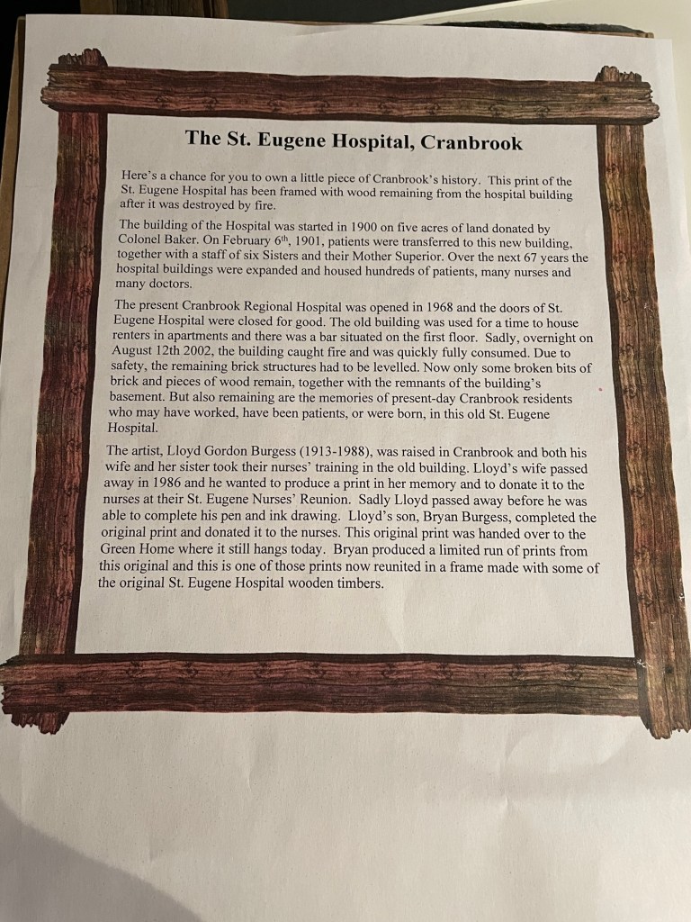 I gave Greg a gift that I’d had for a couple years having bought it in a fundraising auction for my friend Gordon. It is the St Eugene hospital that Greg was born in and after it burned down the artist made the frame from some of the wood that remained. I was keeping it for his 60th but he is in his 60th year, so close enough!