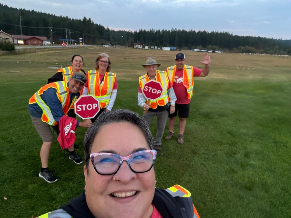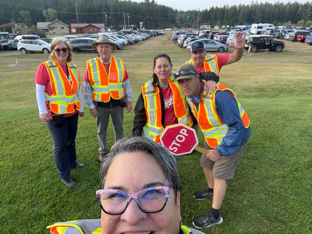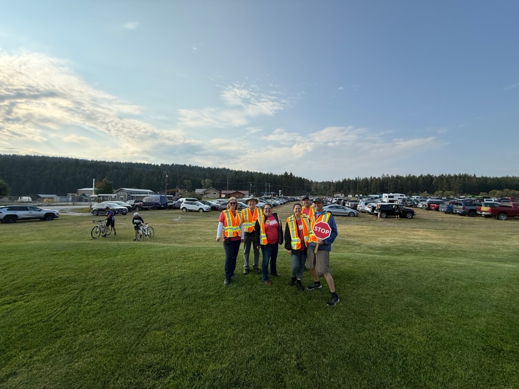 Although it was earlier than I have gotten up in a very long time and 5:30 AM was still in the dark, It was worth it to get picked up by Robin at 6:30 to head to St Eugene resort. I am the parking coordinator with five volunteers from the Rotary club of Cranbrook. We are supporting the sunrise Rotary of Cranbrook by volunteering. Paul and Kambie Heywood, Robyn Hicks, Walter Gramm and Jason Fast were an awesome team of volunteers. I laid out the plan for parking and people started arriving sometime after seven. By 930 we were done. It was a simply gorgeous morning as the sun rose over the reserve and the bikers as they arrived were in such good spirits often thanking us for volunteering. We manage to park over 250 cars and spread the love. I took it before and after picture and then one of the writers took a picture of us in front of the full field, which was lovely.