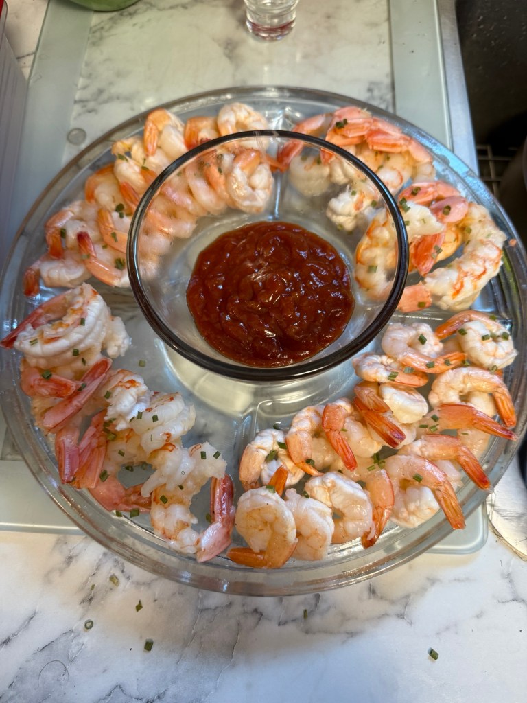 After my appointment, I came home and got an appetizer ready to take to the Rotary ladies get together at Judy’s house. I gently sautéed some shrimp and prawns in butter and a few spices added a sprinkle of chives and some sauce in the centre for dipping. It went over very well. There was a lovely gathering of about 14 ladies I think who all brought different appies and we had a good visit for a couple of hours. I enjoyed getting to know Rebecca better and was really glad she came as she is only 27 I think in a new Rotarian. I’m glad I ran into her today and encouraged her to come. She said she had a good time.