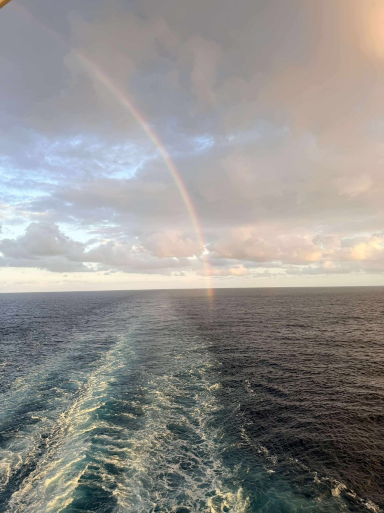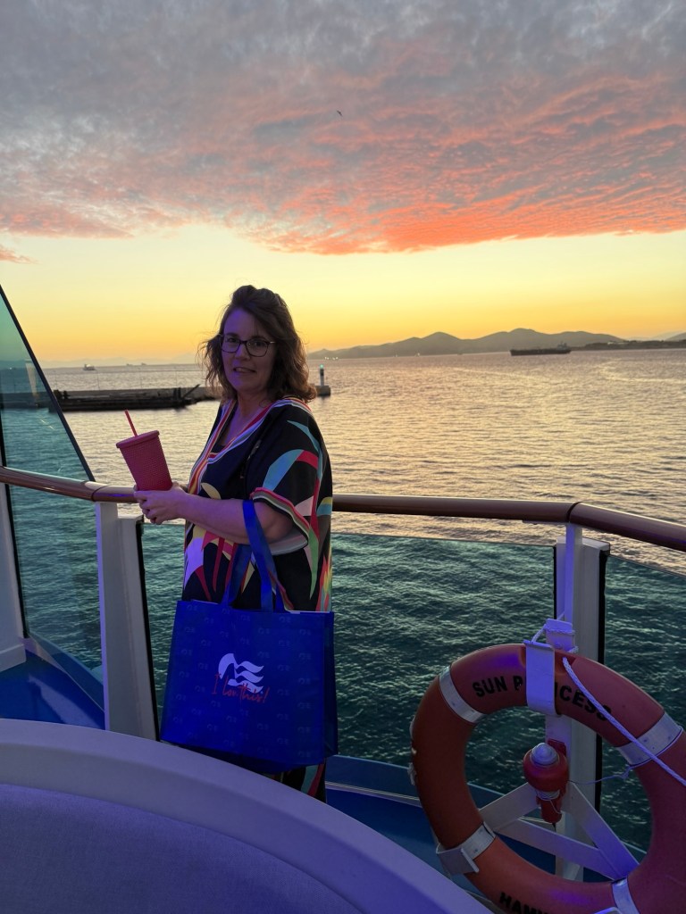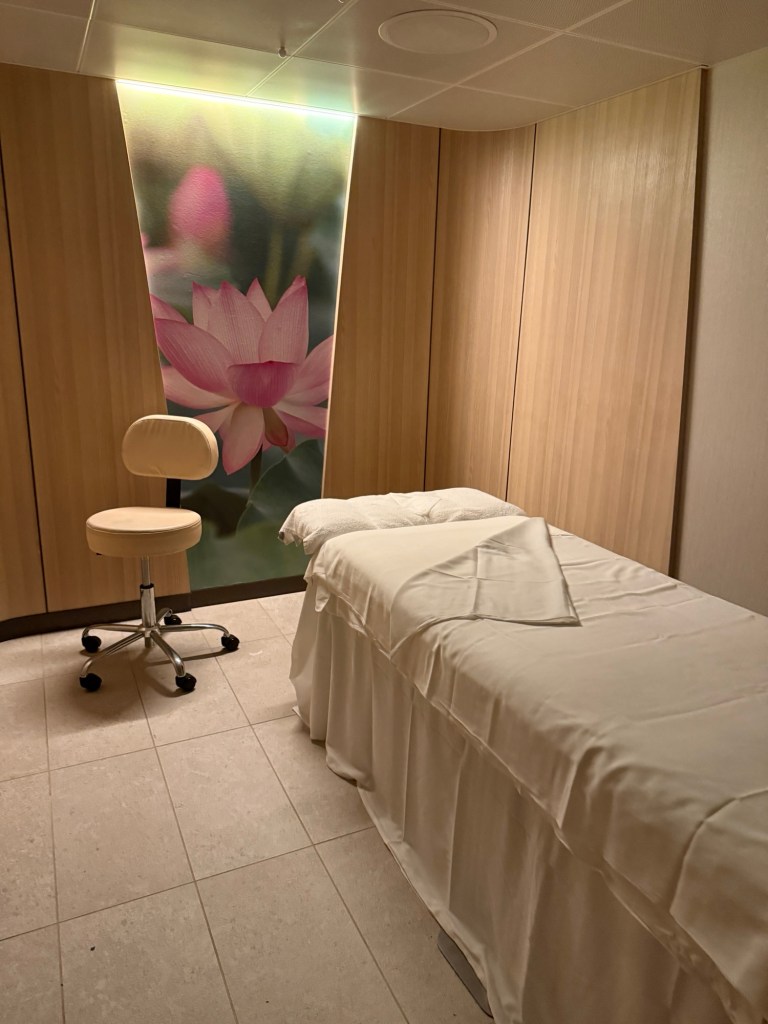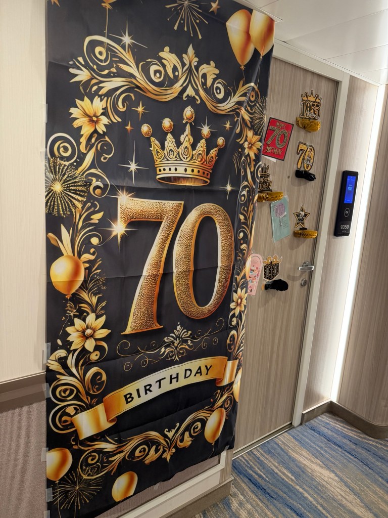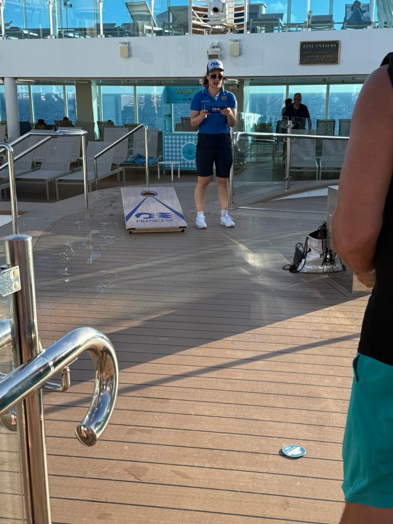 For the better part of the day, I wandered around and checked things out and chatted with people and spent a portion of it in my room doing work. I then went and played in a cornhole tournament on the Lido deck and that was just fun. At 4:45 I had a 75 minute full body massage in the lotus spa. For my therapist was brilliant. She has such strong hands. Tears also very grateful for the moody bee lip balm that I gave her. my room steward said my lights on my door give him a warm feeling