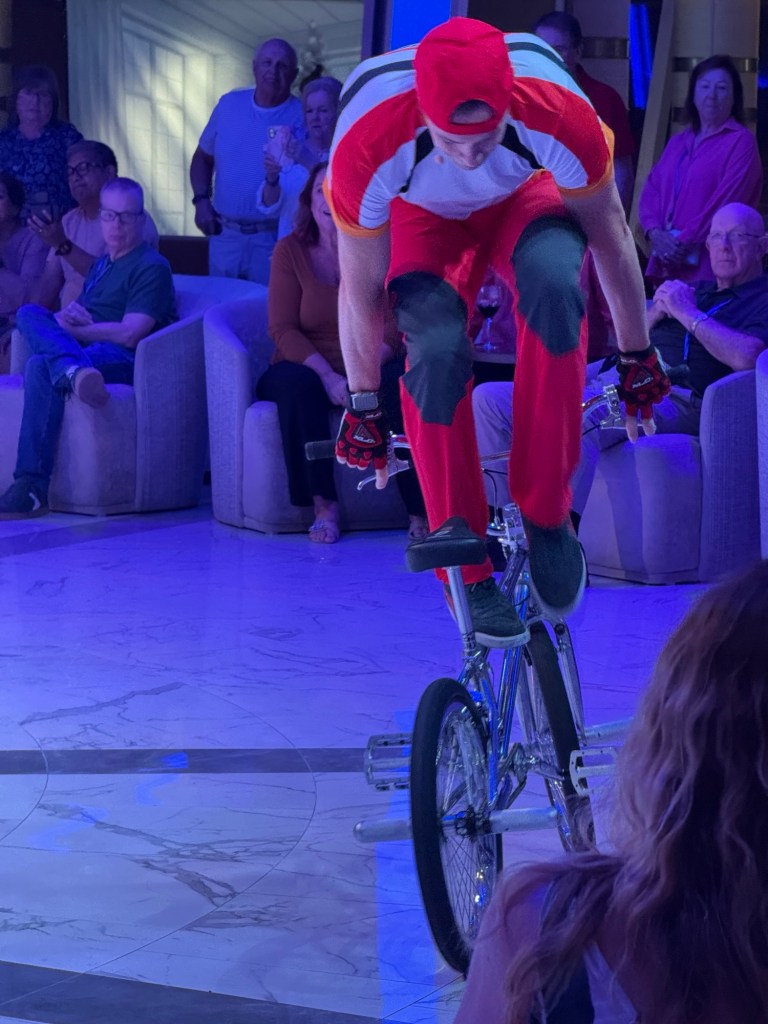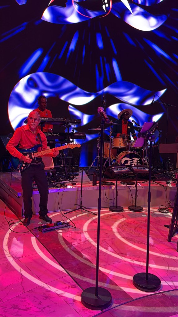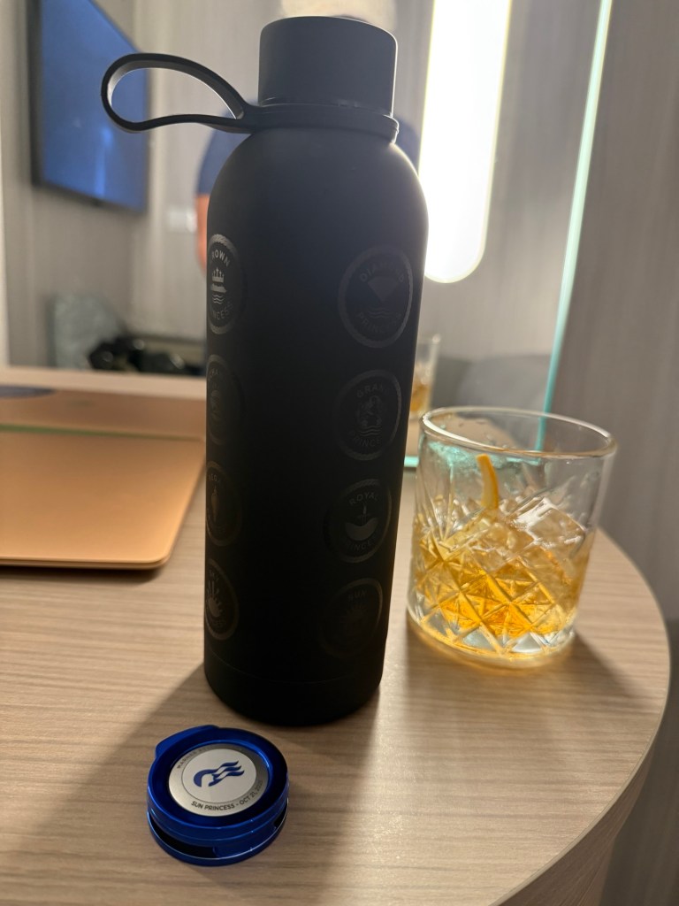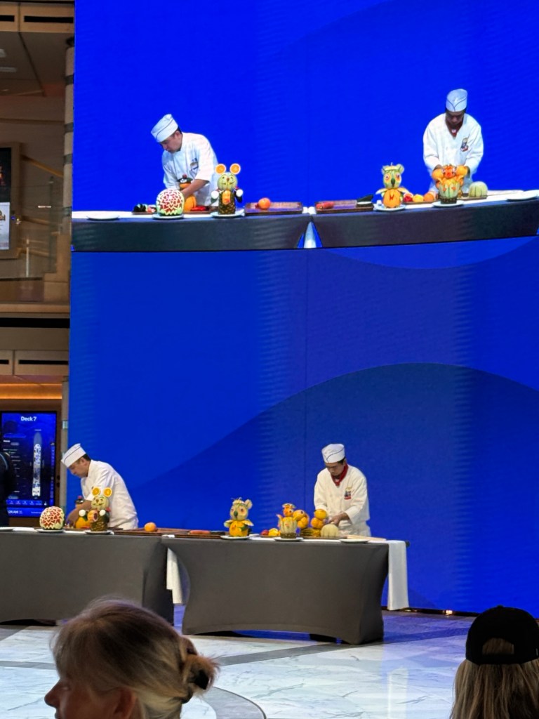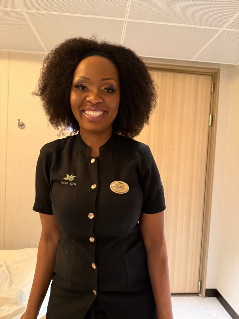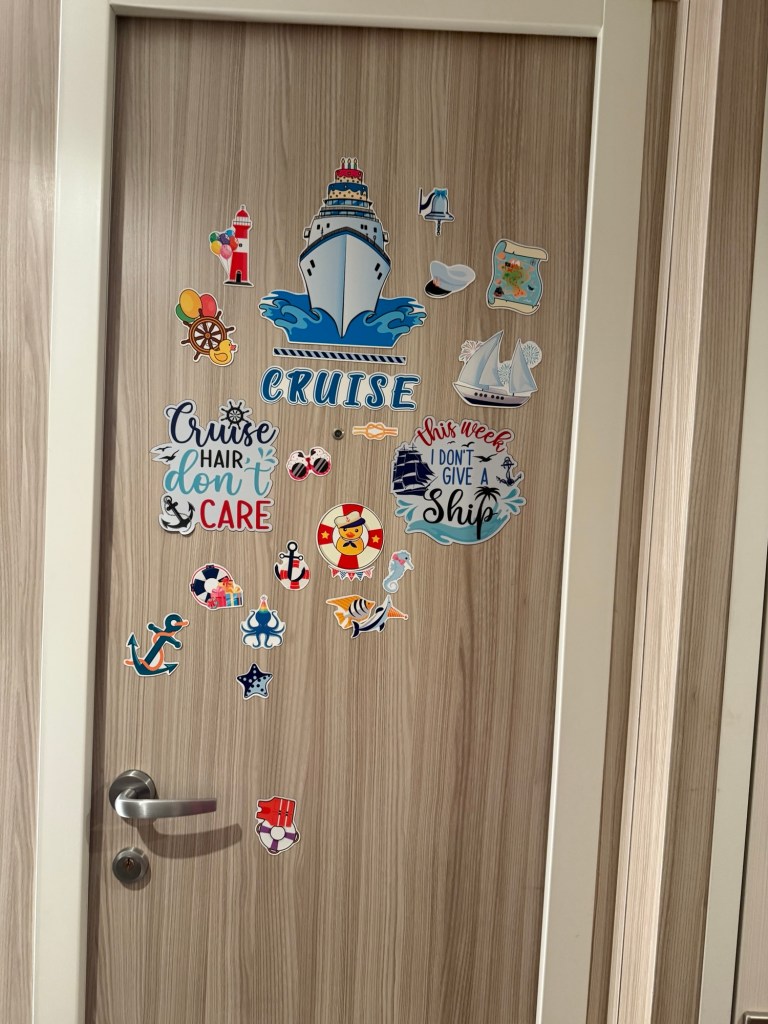 For the better part of the day, I wandered around and checked things out and chatted with people and spent a portion of it in my room doing work. I then went and played in a cornhole tournament on the Lido deck and that was just fun. At 4:45 I had a 75 minute full body massage in the lotus spa. For my therapist was brilliant. She has such strong hands. Tears also very grateful for the moody bee lip balm that I gave her. my room steward said my lights on my door give him a warm feeling