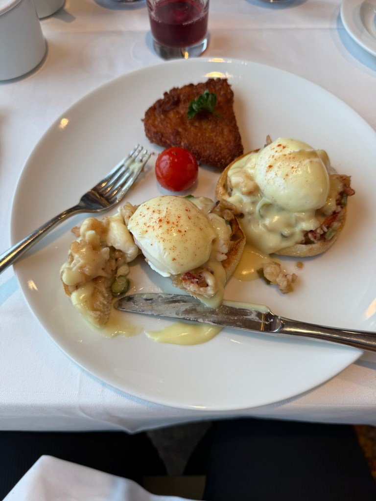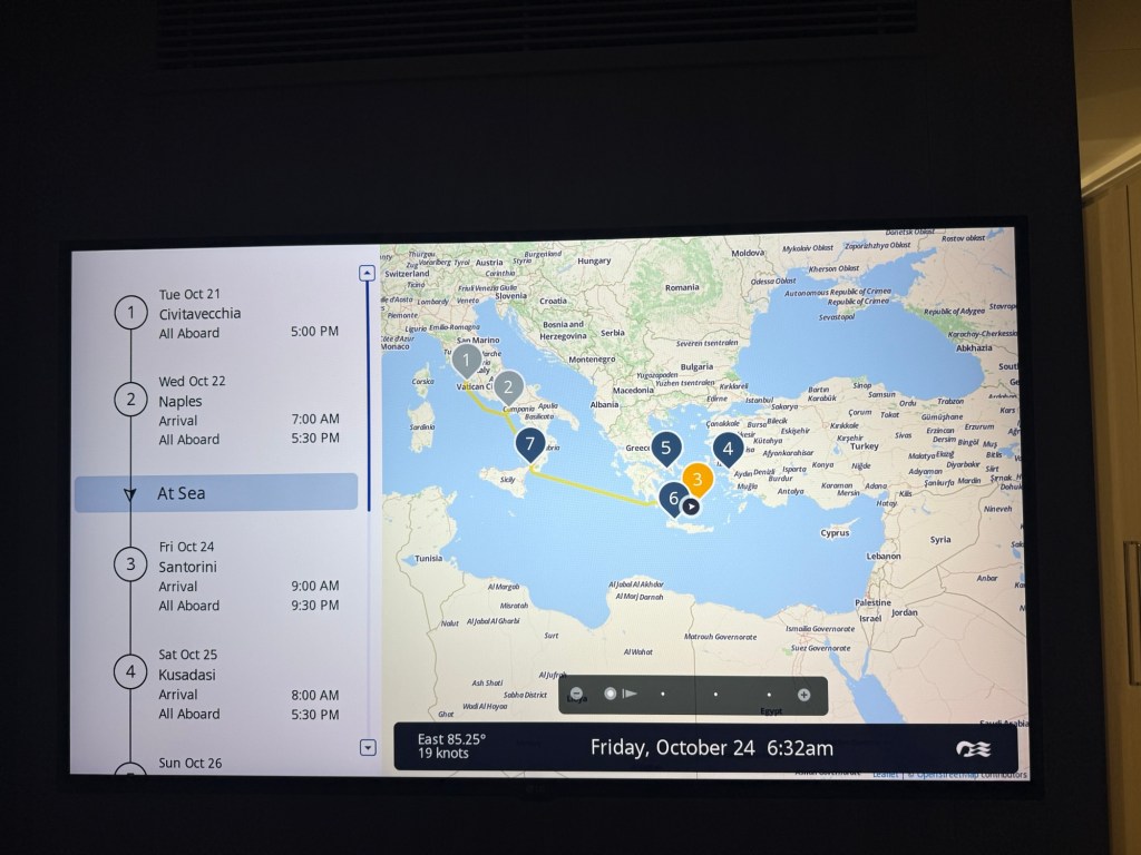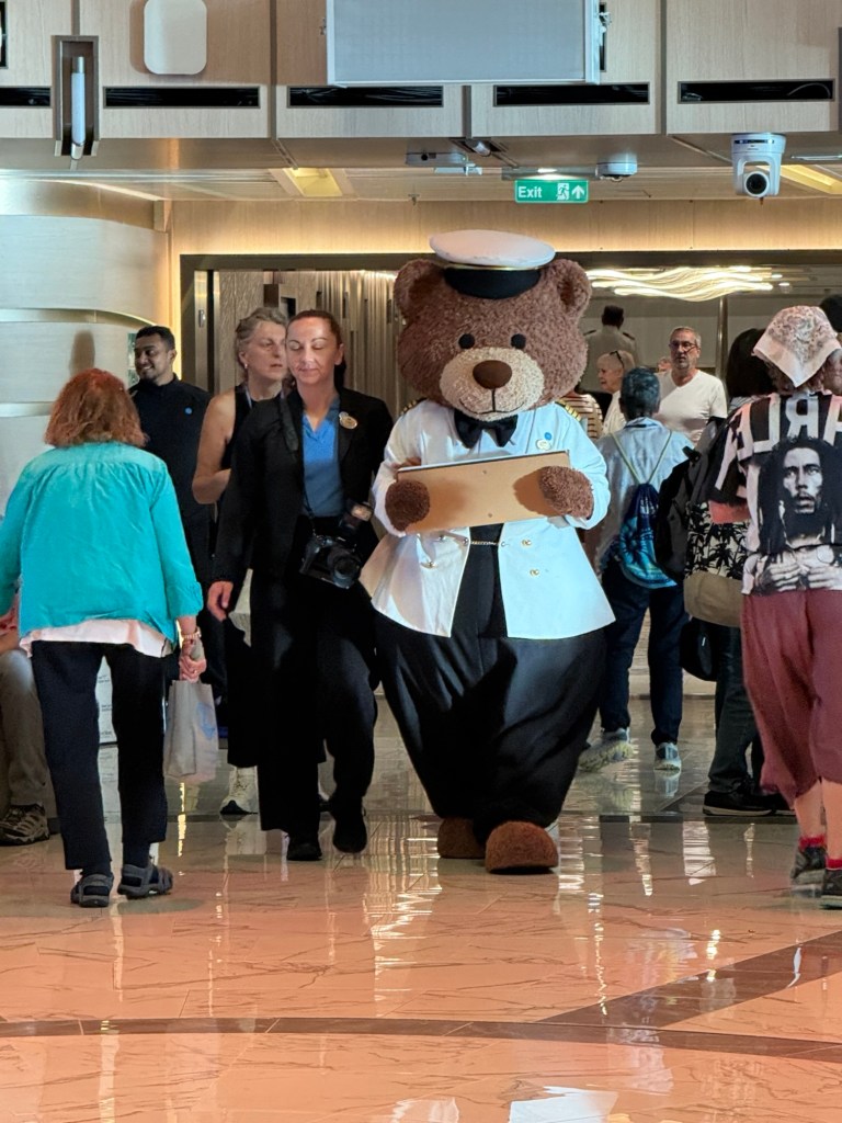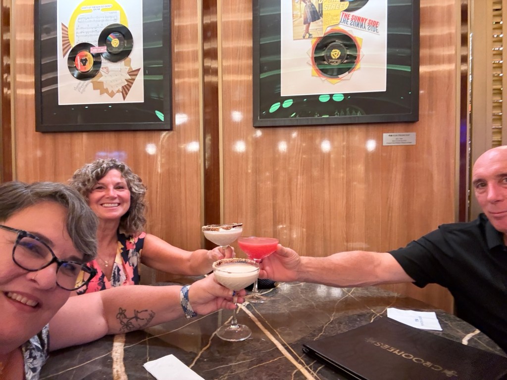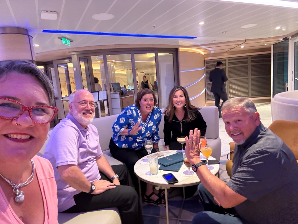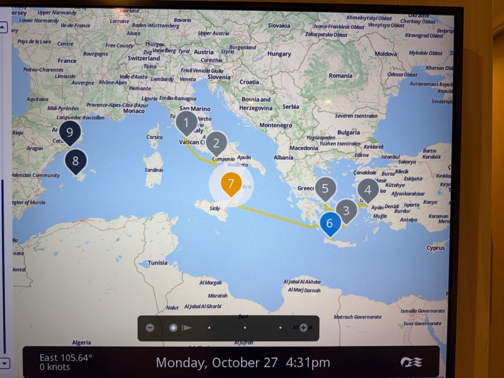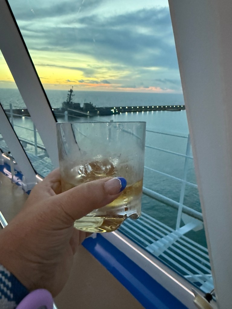Up early and ready quick. Had a quick coffee and snacks at the place next door and then jumped in a beautiful van/limo driven by Luka. It was raining and he was a great driver and eventually we were at the port. Although I was separated twice from Wyatt’s, I was onboard before most people. I found a spot on Deck 8 and got some urgent work done. The lovely Gracia was my person and kept the mimosas coming.