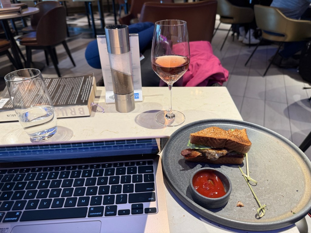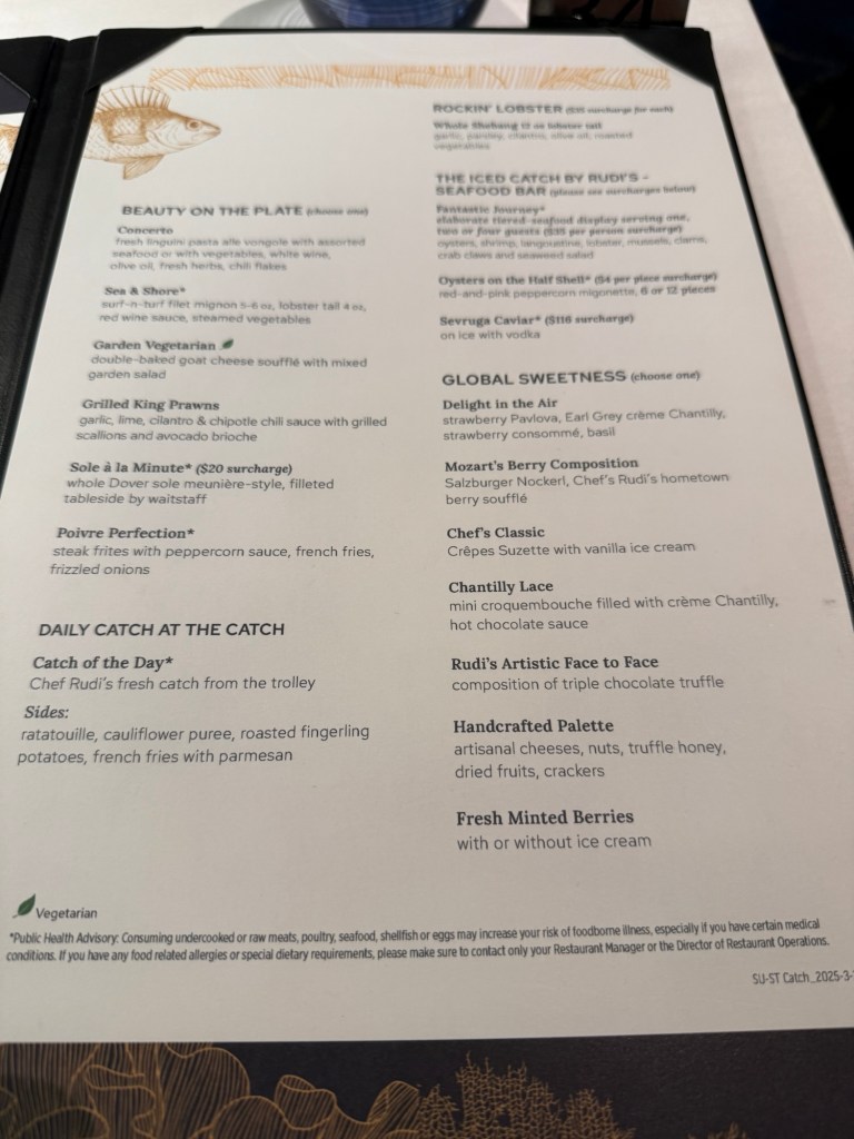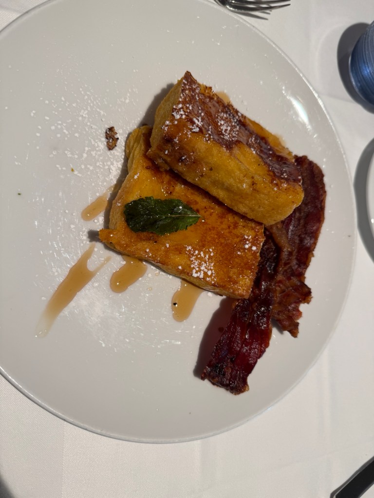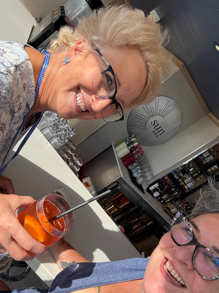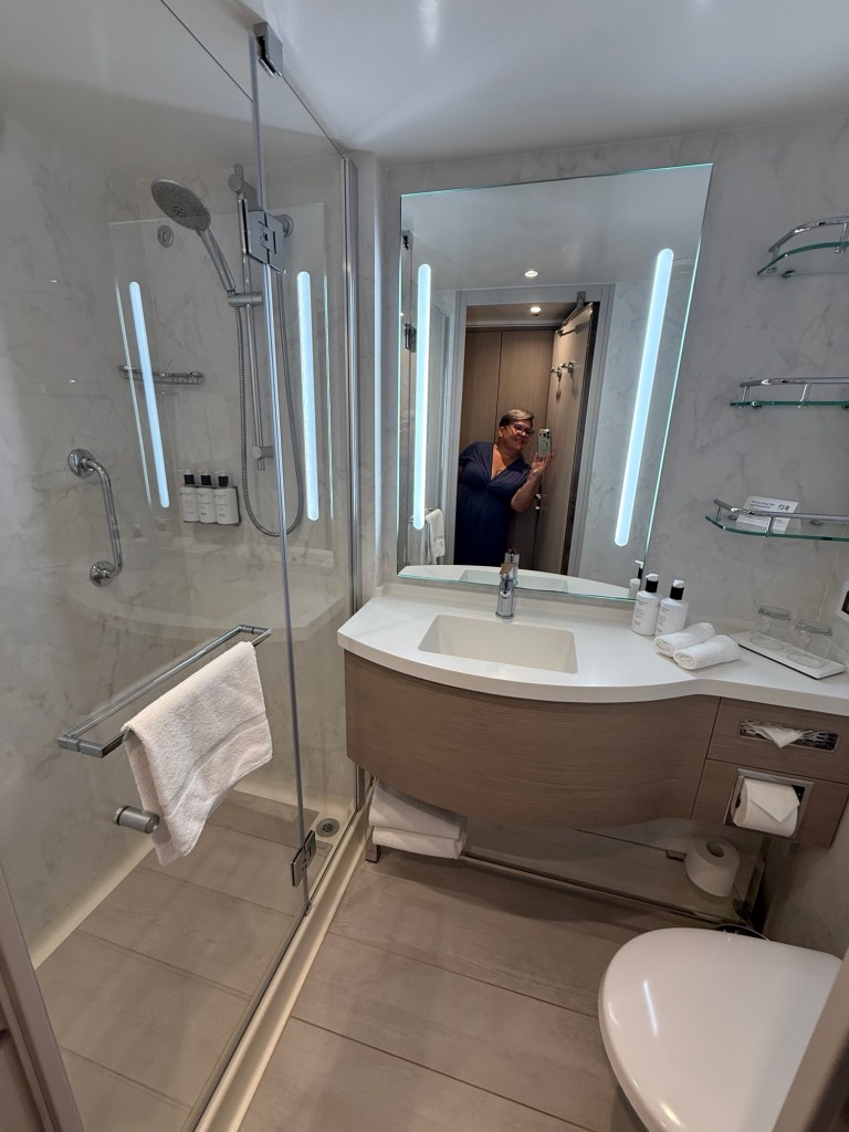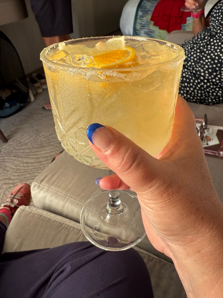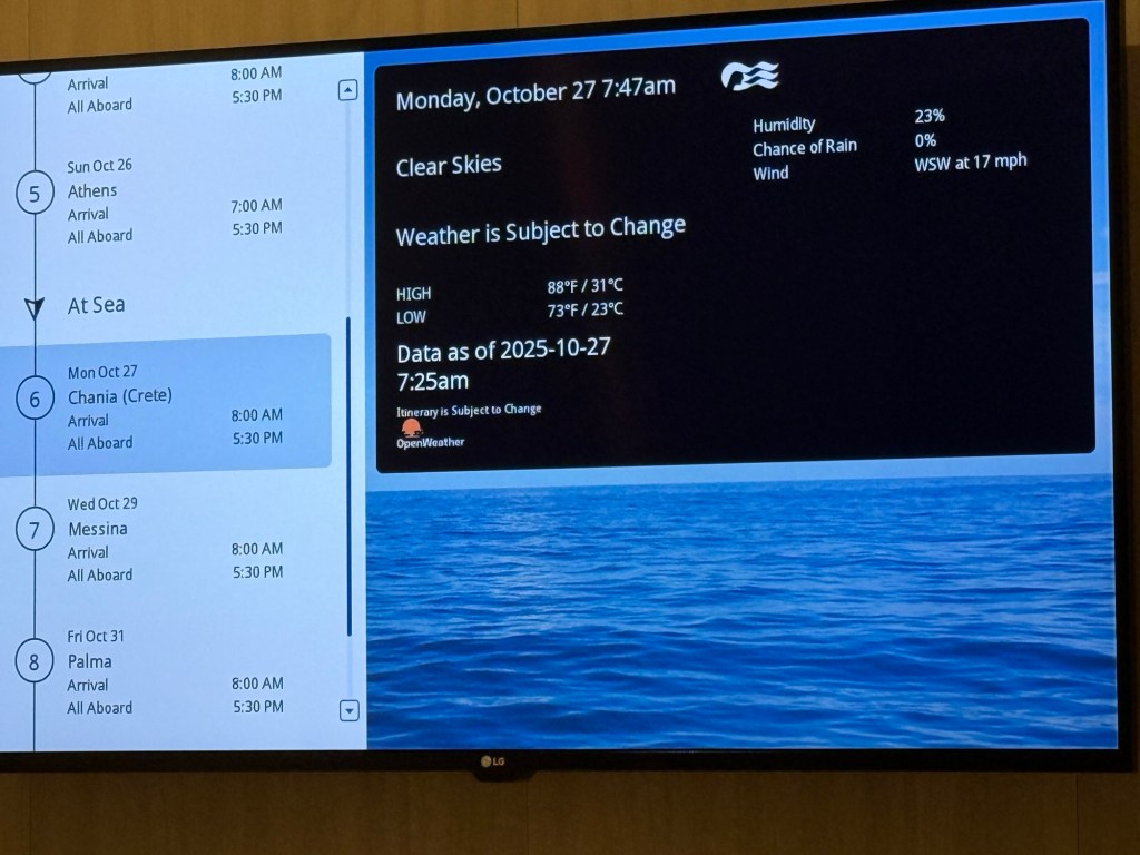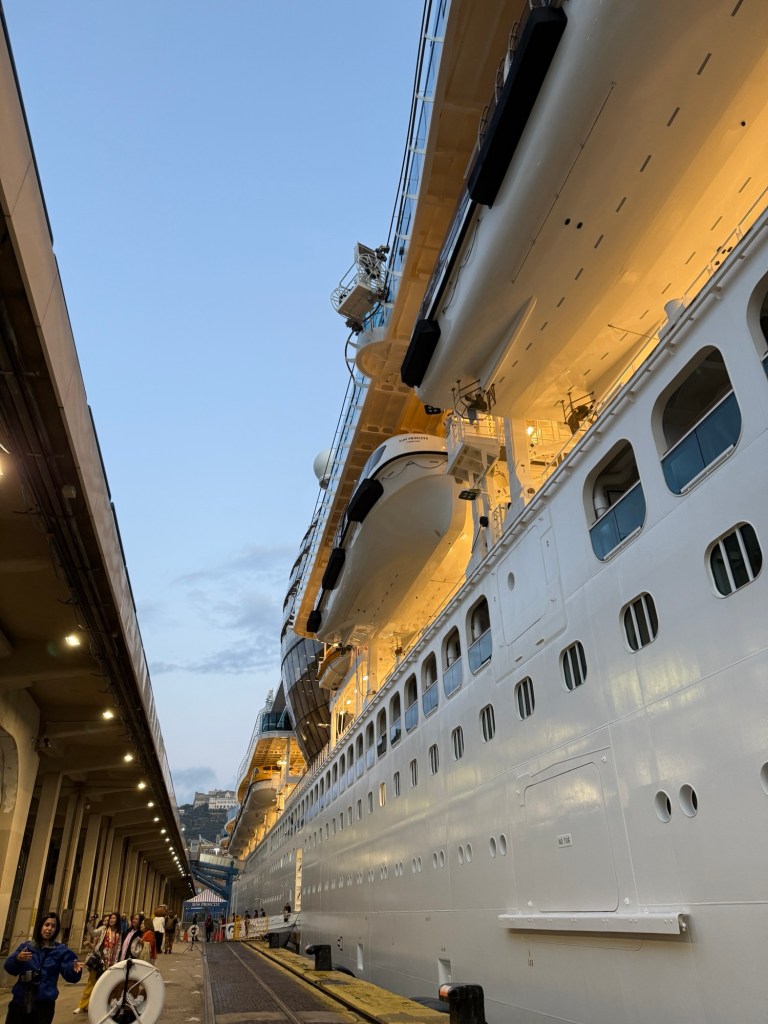 Up early and ready quick. Had a quick coffee and snacks at the place next door and then jumped in a beautiful van/limo driven by Luka. It was raining and he was a great driver and eventually we were at the port. Although I was separated twice from Wyatt’s, I was onboard before most people. I found a spot on Deck 8 and got some urgent work done. The lovely Gracia was my person and kept the mimosas coming.