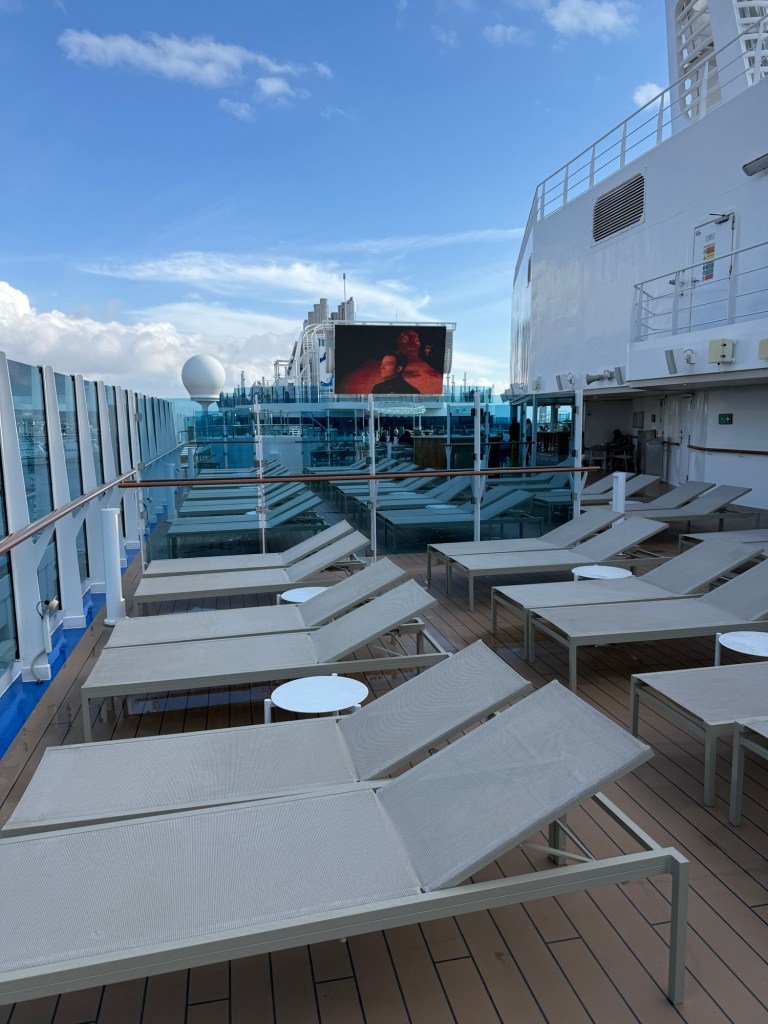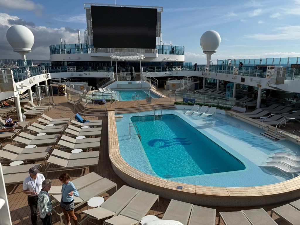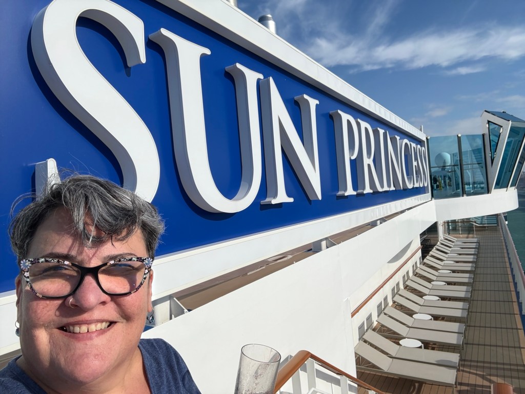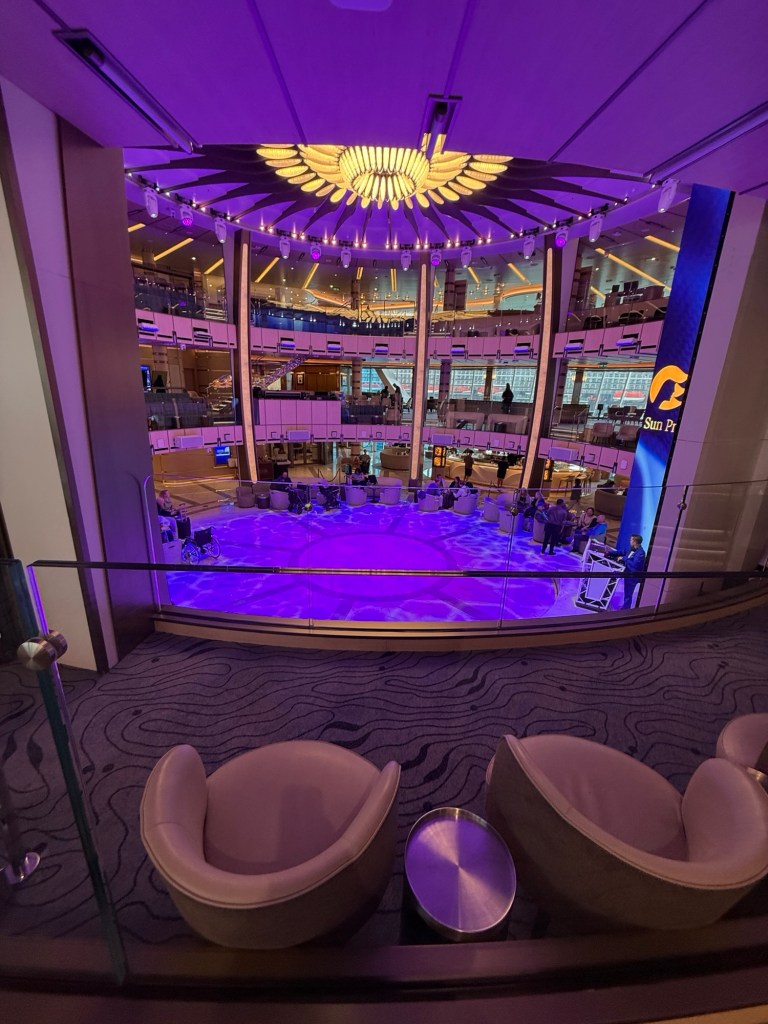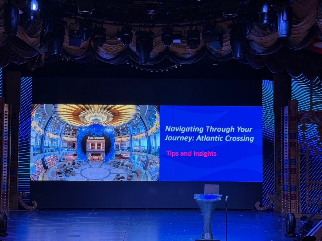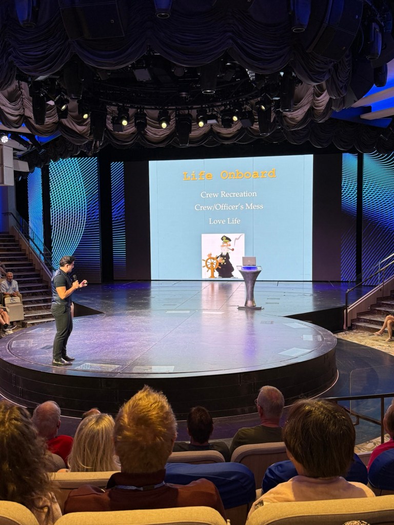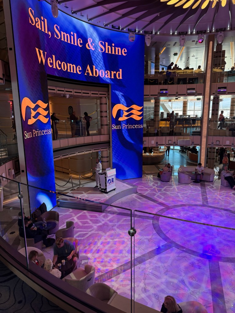 I didn’t have an alarm set yet. I still woke up early, so I texted Wendy because I knew she would be up and met her for real breakfast. I had a French toast and she had a frittata, and then we went for a bit of a tour and then sat on the Lido deck with our feet in the pool. It was nice there was hardly anyone around because it was so early in the morning. My ankle has been bothering me quite a bit from putting it through the paces. after that we went to the Princess Arena for a Life at Sea presentation by our cruise director, Cole, who is a 28 year old retired dancer from New Zealand. He showed us how the crew lives behind the scenes