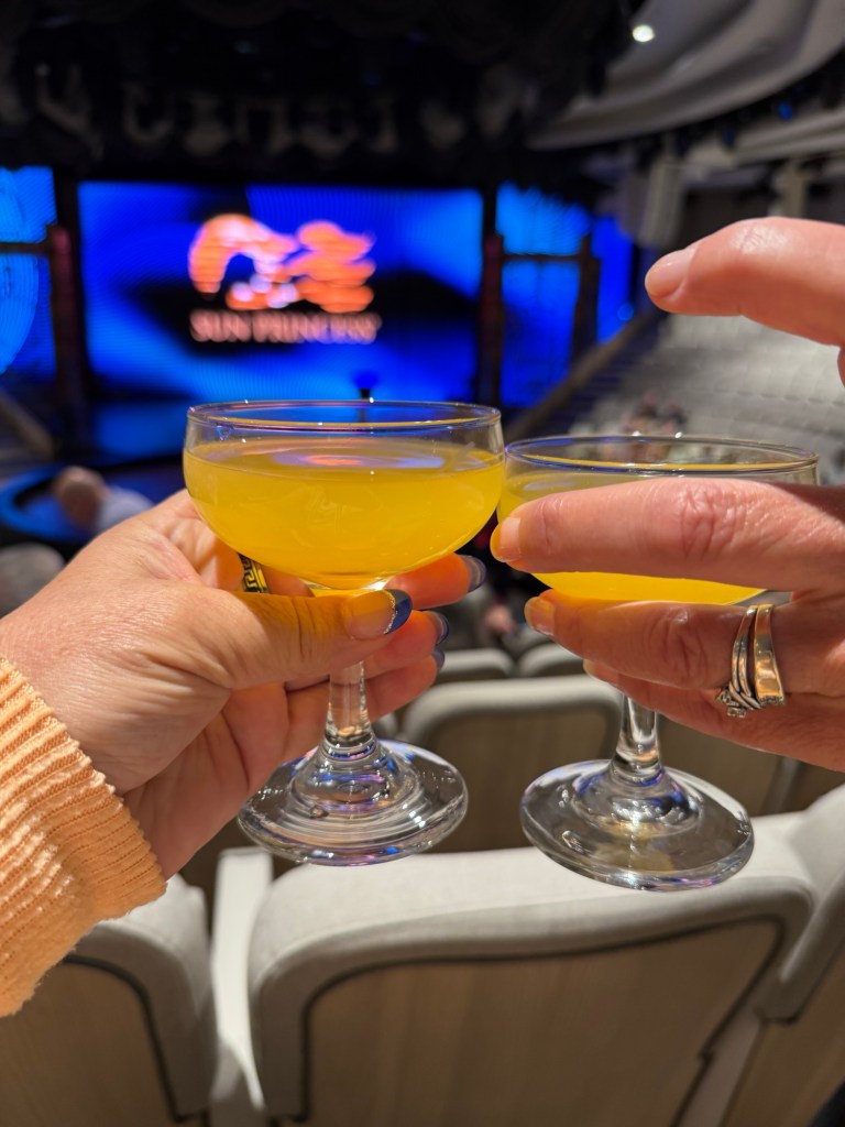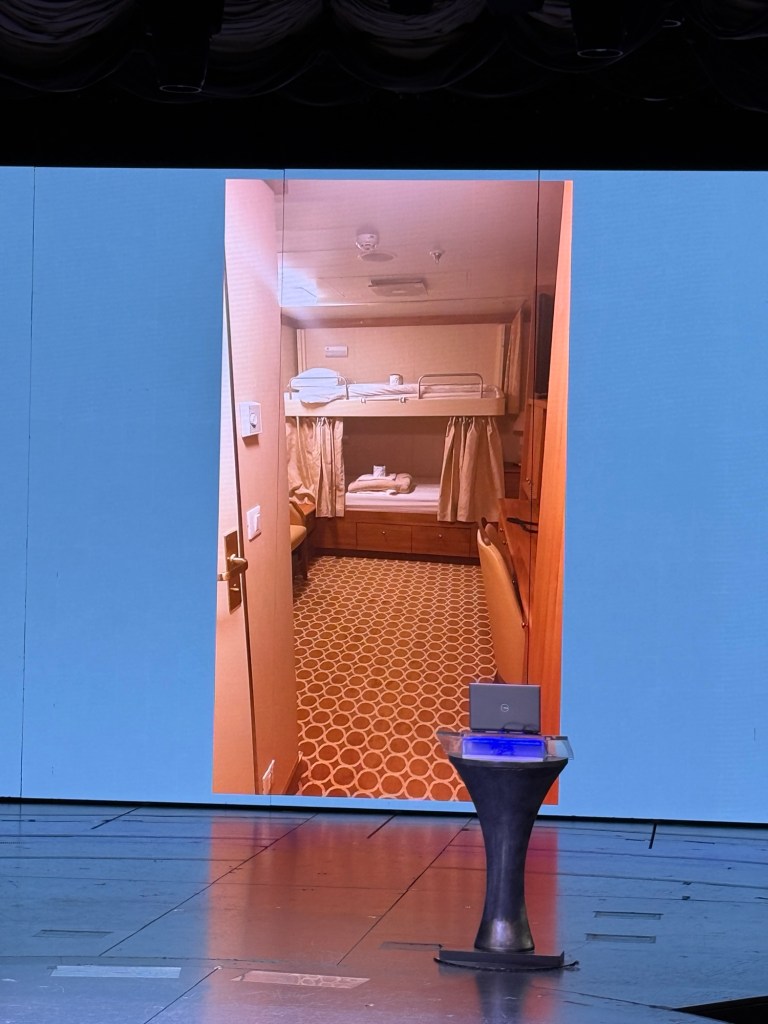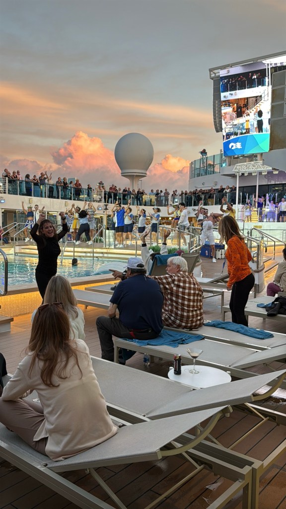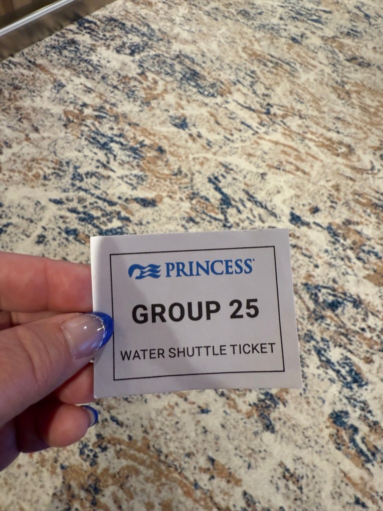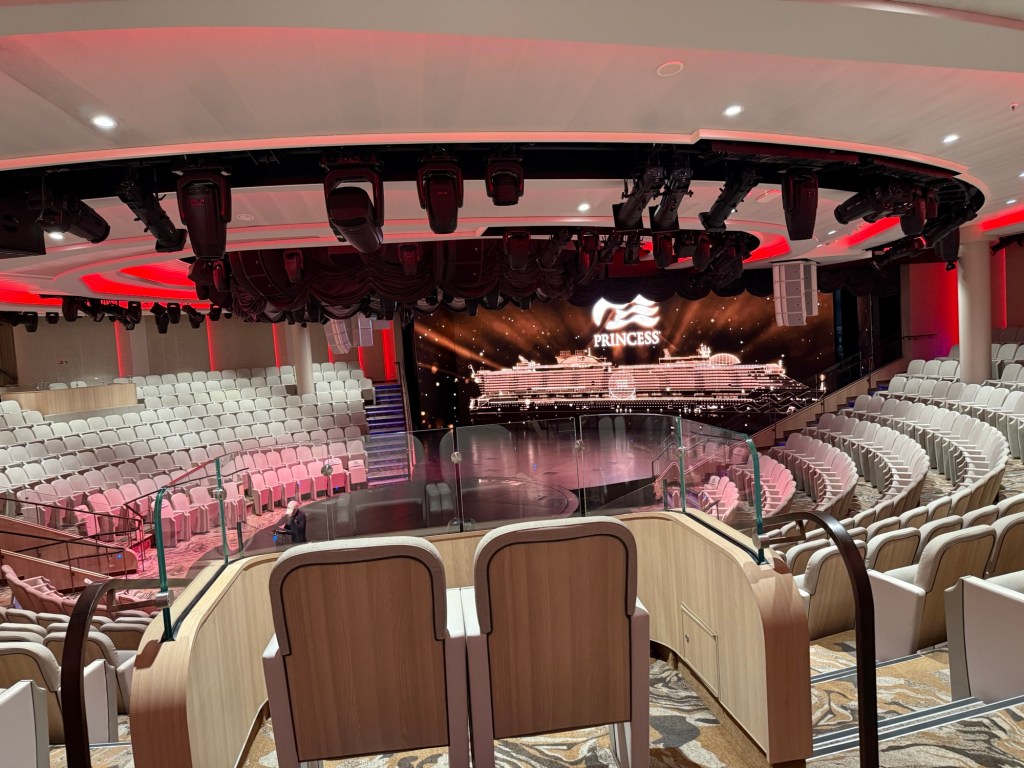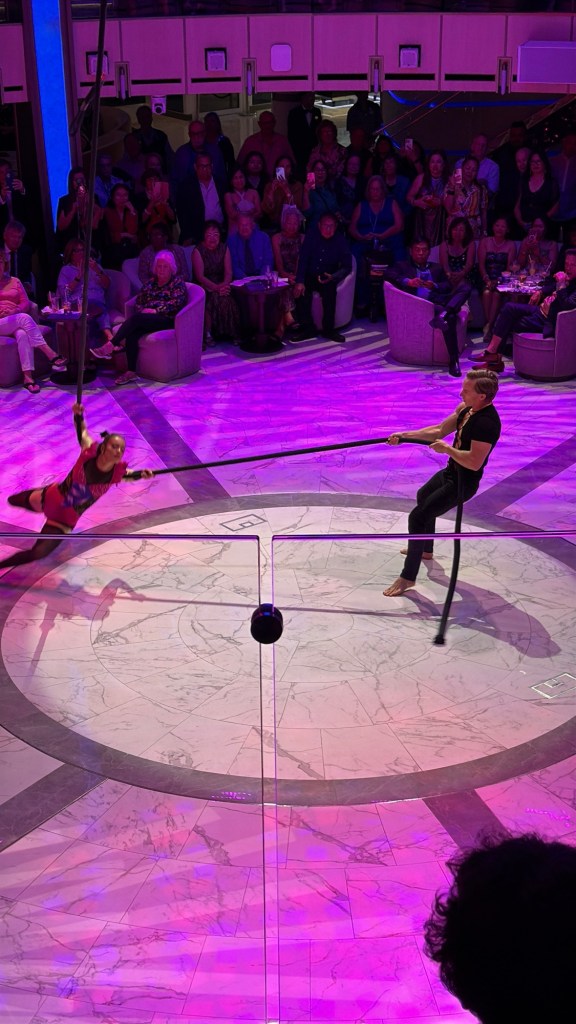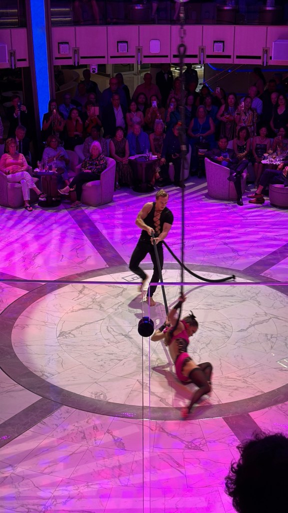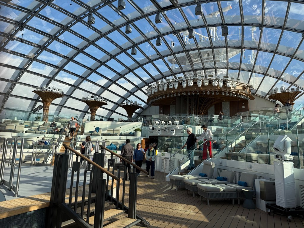 I didn’t have an alarm set yet. I still woke up early, so I texted Wendy because I knew she would be up and met her for real breakfast. I had a French toast and she had a frittata, and then we went for a bit of a tour and then sat on the Lido deck with our feet in the pool. It was nice there was hardly anyone around because it was so early in the morning. My ankle has been bothering me quite a bit from putting it through the paces. after that we went to the Princess Arena for a Life at Sea presentation by our cruise director, Cole, who is a 28 year old retired dancer from New Zealand. He showed us how the crew lives behind the scenes