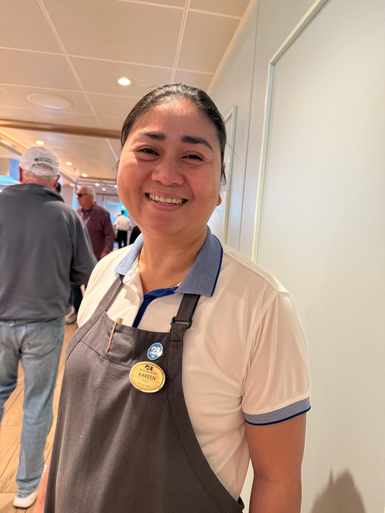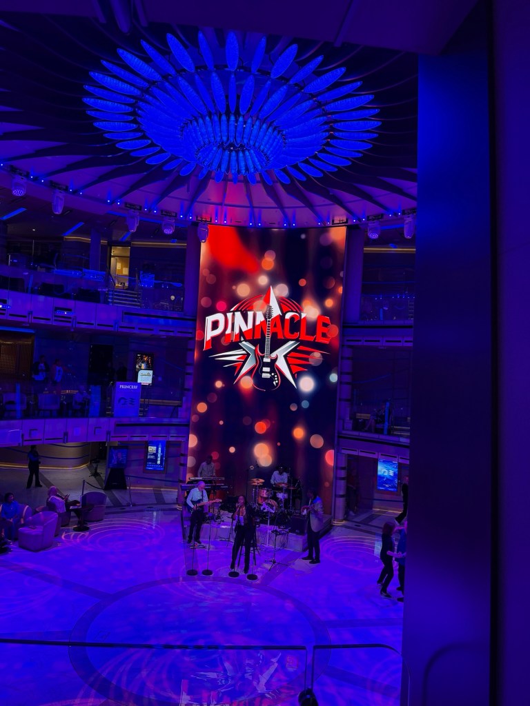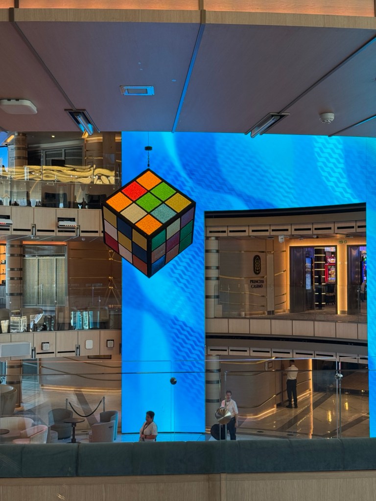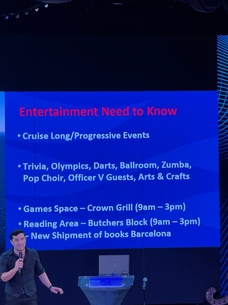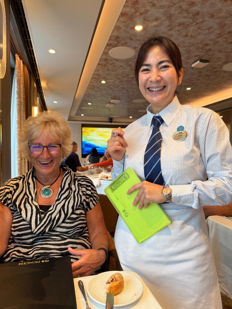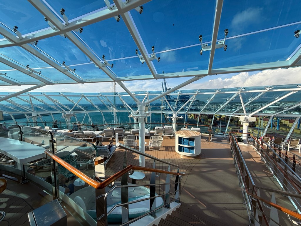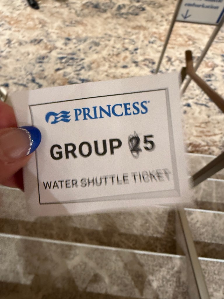 I didn’t have an alarm set yet. I still woke up early, so I texted Wendy because I knew she would be up and met her for real breakfast. I had a French toast and she had a frittata, and then we went for a bit of a tour and then sat on the Lido deck with our feet in the pool. It was nice there was hardly anyone around because it was so early in the morning. My ankle has been bothering me quite a bit from putting it through the paces. after that we went to the Princess Arena for a Life at Sea presentation by our cruise director, Cole, who is a 28 year old retired dancer from New Zealand. He showed us how the crew lives behind the scenes