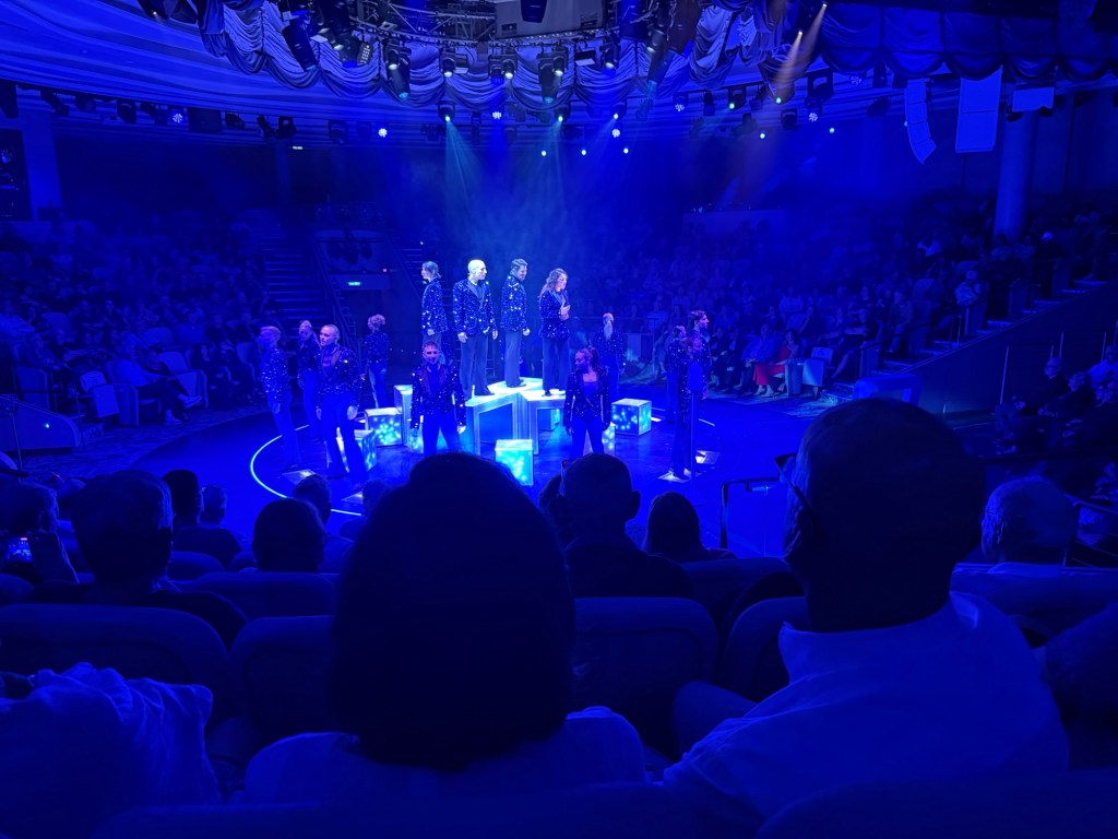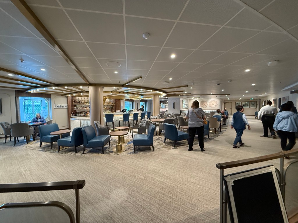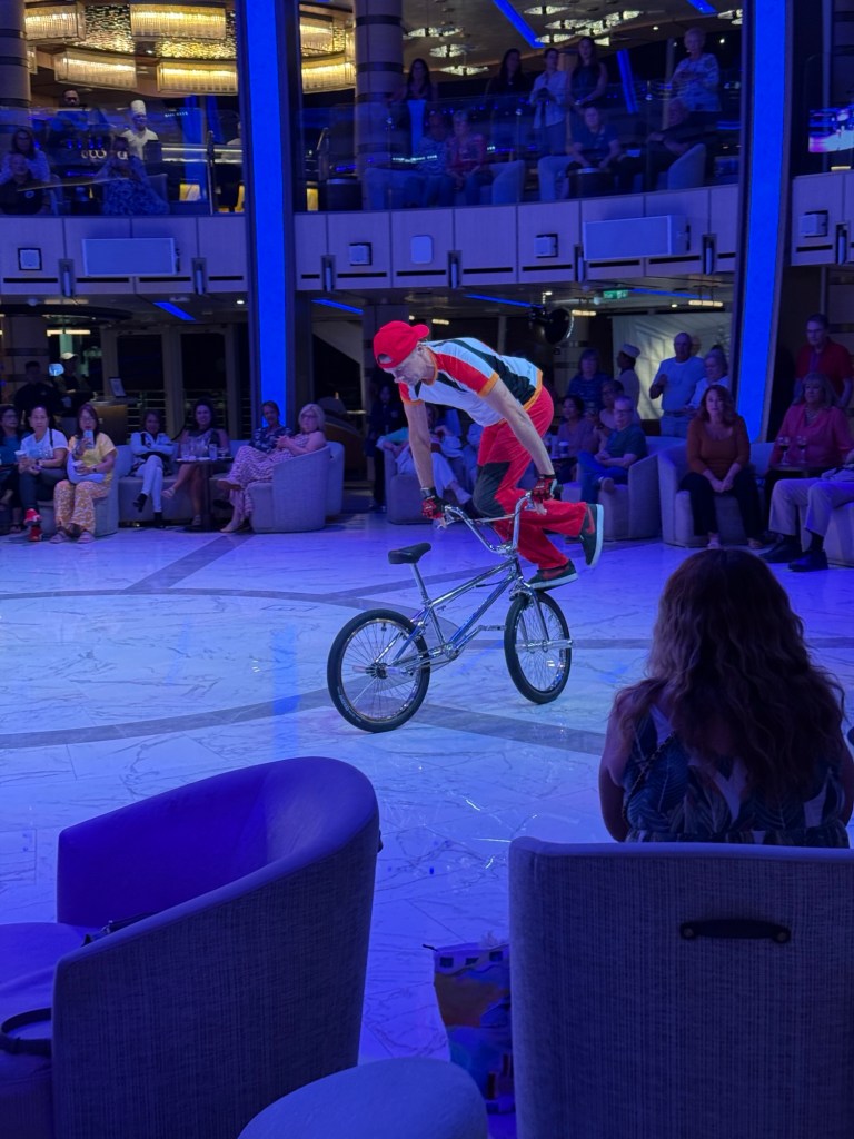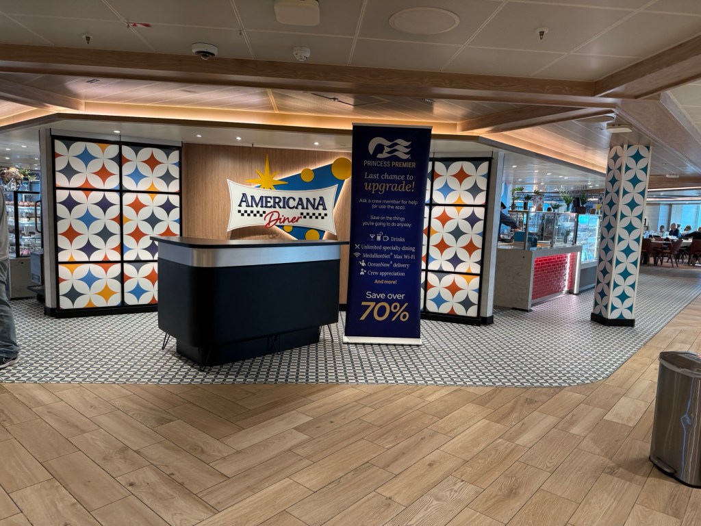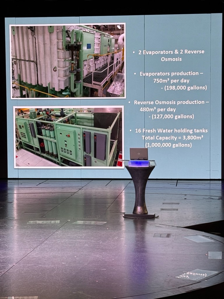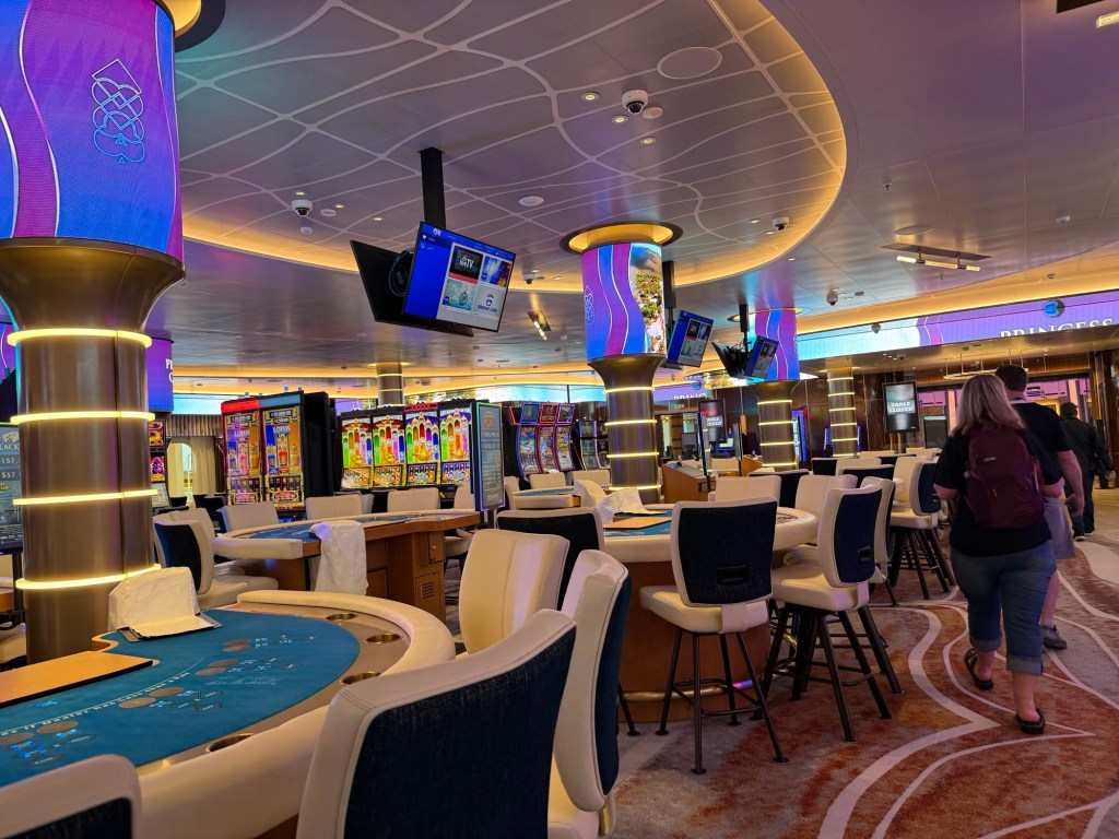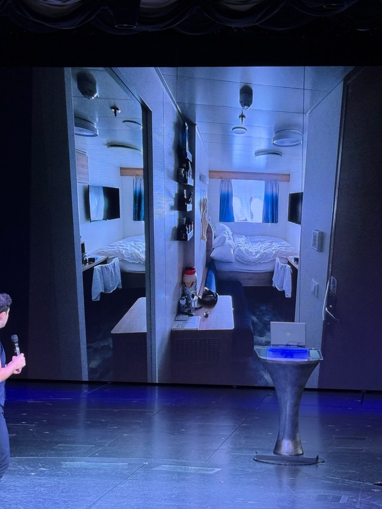 I didn’t have an alarm set yet. I still woke up early, so I texted Wendy because I knew she would be up and met her for real breakfast. I had a French toast and she had a frittata, and then we went for a bit of a tour and then sat on the Lido deck with our feet in the pool. It was nice there was hardly anyone around because it was so early in the morning. My ankle has been bothering me quite a bit from putting it through the paces. after that we went to the Princess Arena for a Life at Sea presentation by our cruise director, Cole, who is a 28 year old retired dancer from New Zealand. He showed us how the crew lives behind the scenes