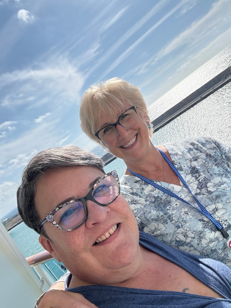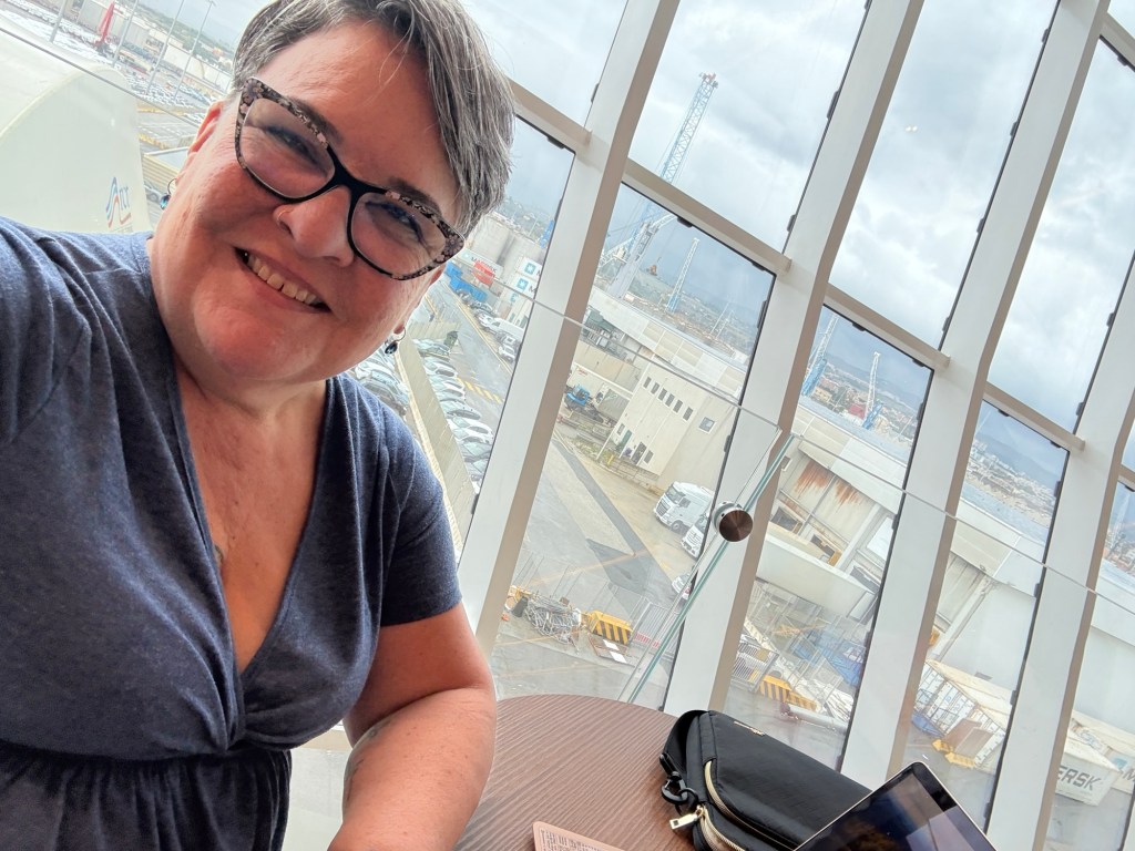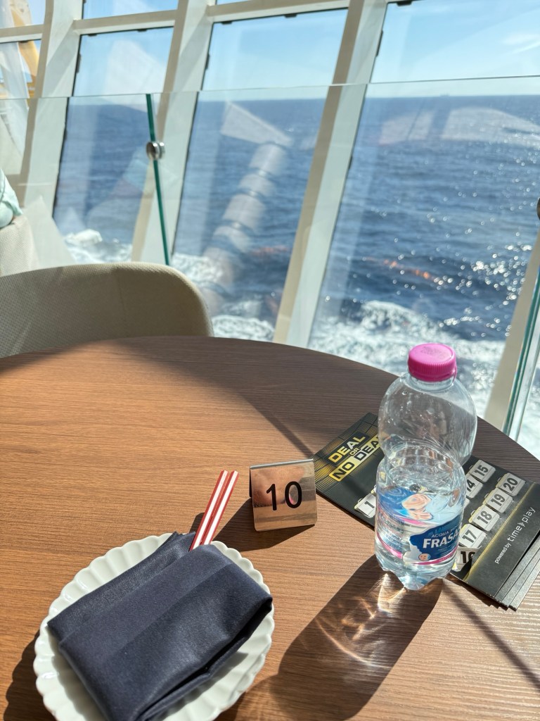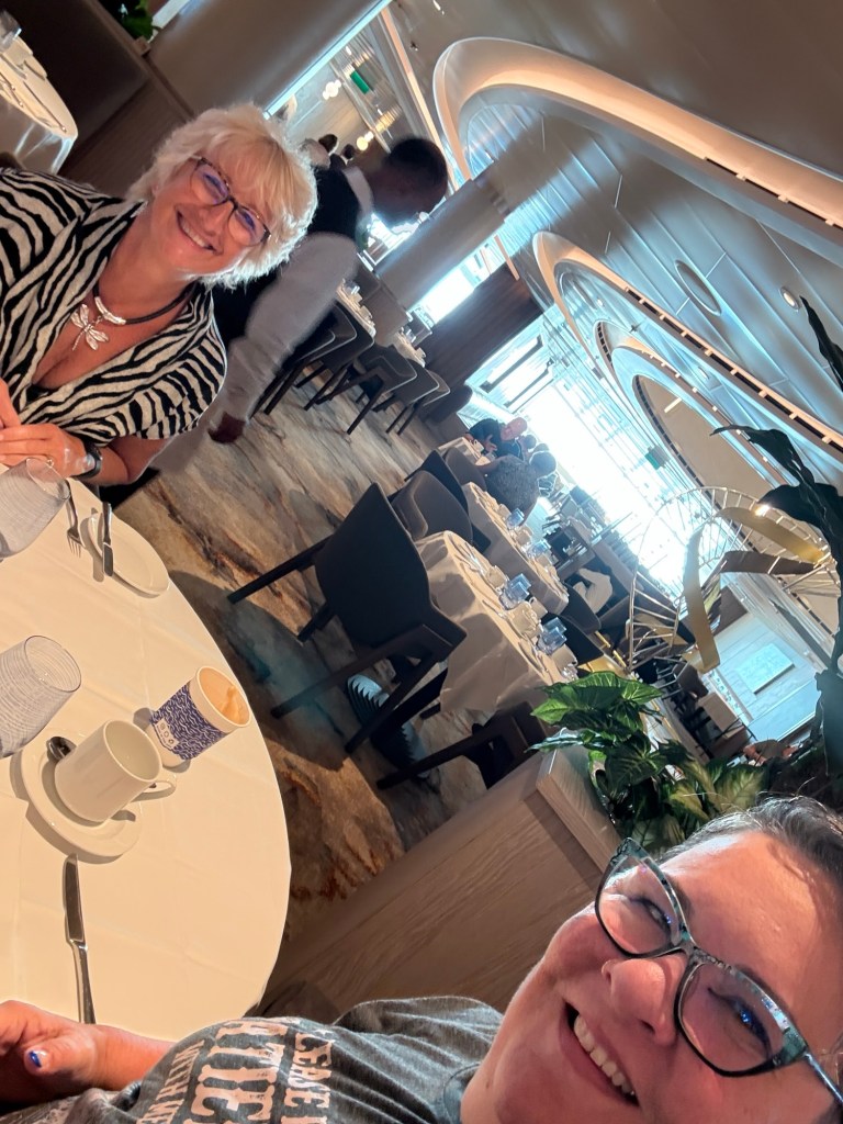 I was up at a decent time and Wendy messaged me to join her for breakfast. She had a lovely spot beside the window and I had a lobster. Benny was amazing. We hung out for the morning, including going to sessions about the transition from this cruise to the next one as I learned I am actually on the back-to-back cruise and when Wendy and her crew and Ginger and Glynn get off in Barcelona, that will be the end of the first leg of the trip. When I come back to the ship after my day in Barcelona, I will be having a stamp in my passport and officially have left the EU, even though it is weird because we are still going to Seville and Tenerife that are part of the EU.
