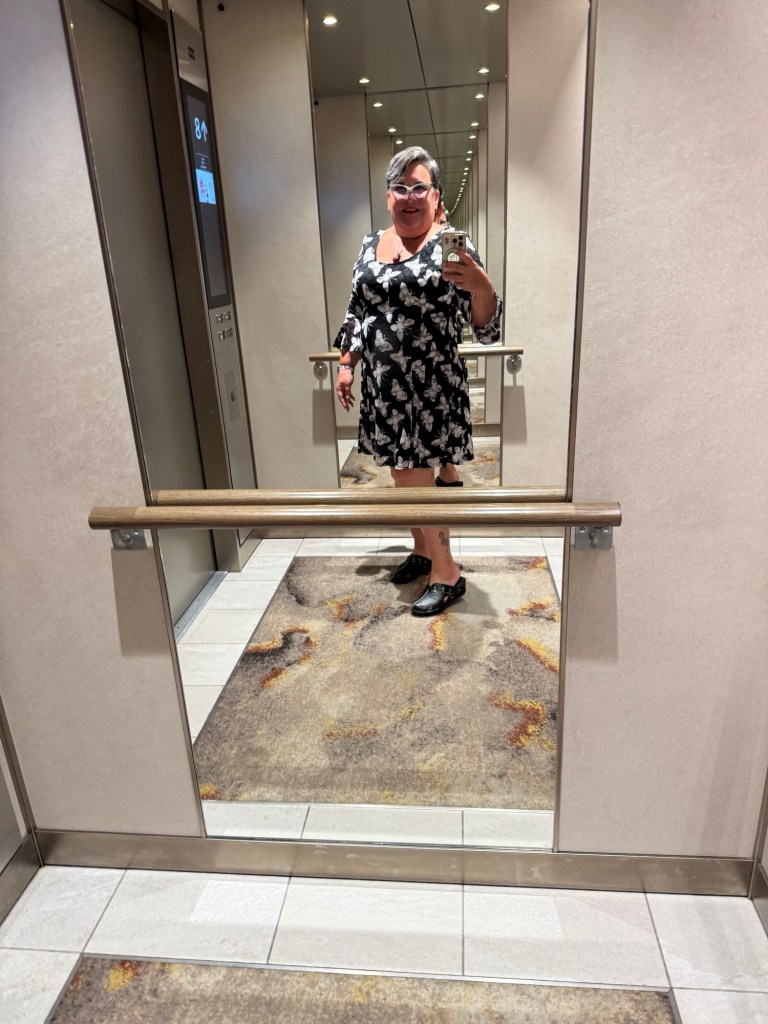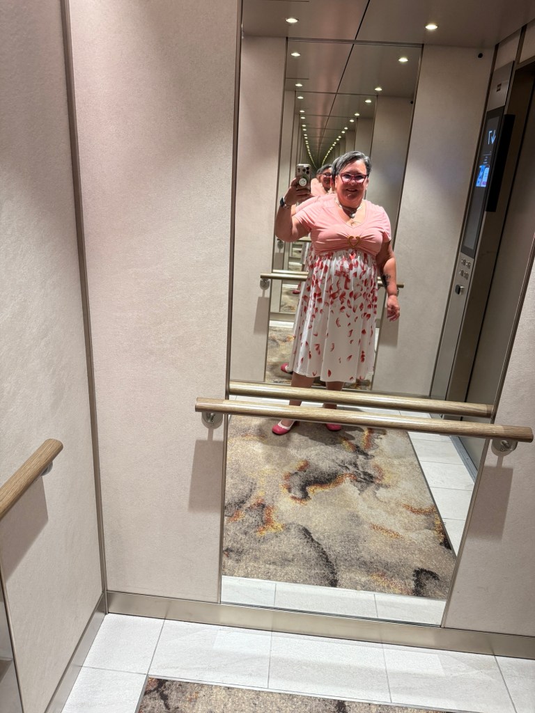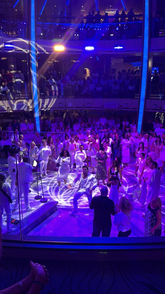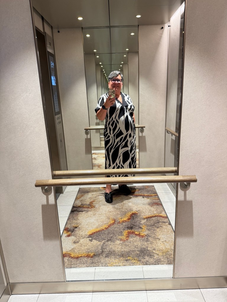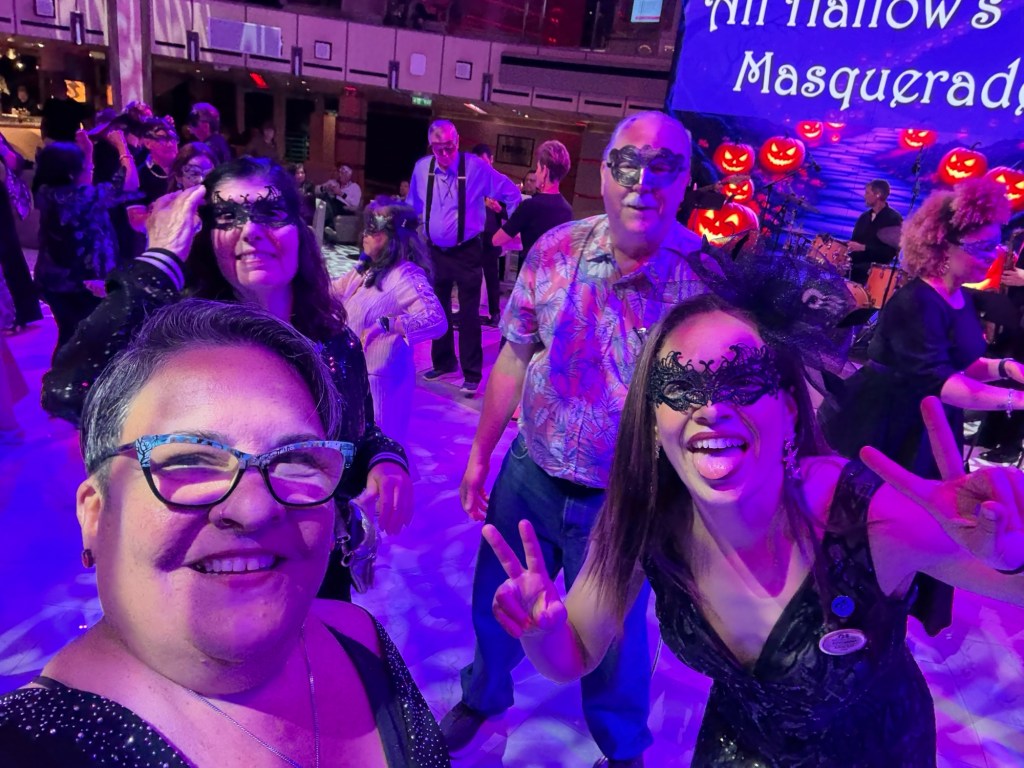 I actually did a lot of things today, including bingo game and food with friends, got a few payroll done for back home, met Wendy for a dinner, my treat at the crown grill where we had some great deeper conversations and a man proclaiming to be a matchmaker said there was a guy at the bar that I needed to meet and it turns out it’s the same person that the bartender said several months ago I needed to meet. Unfortunately, we met tonight and he leaves the ship Saturday morning. He’s from outside of Toronto and kind of my type but I’m not sure entirely that he was interested however, I found it interesting that two different people wanted me to find my someone. After Wendy left to go to bed and I had a beverage at the bar chatting with that gentleman I decided to head to the masquerade ball where we are encouraged to wear black and while I was standing there watching one of the lovely crew members recognize me and drew me out onto the dance floor where I had a little fun and as I was heading back to the elevators to go to my room, a tall, gorgeous woman stop me rearrange my outer layer to show more push the girls up into business and said there you go. It was truly an awesome moment. It was a shame that I was just getting a little later and heading back to my room because she clearly saw something in me.