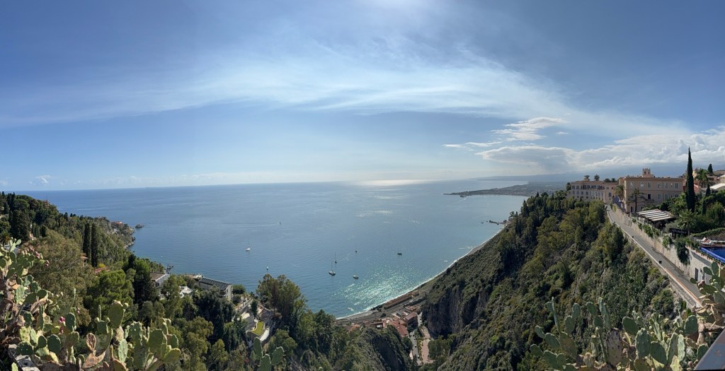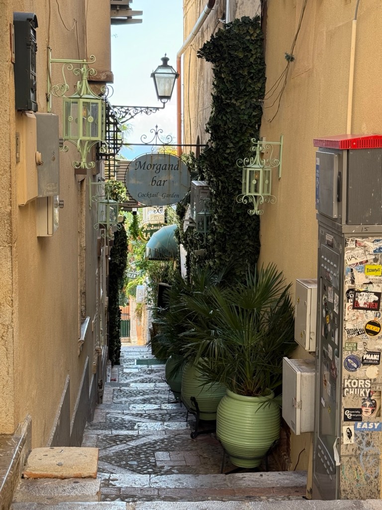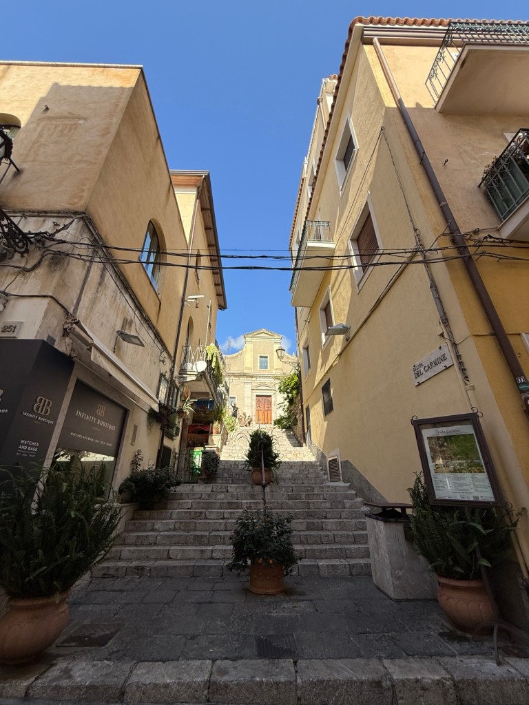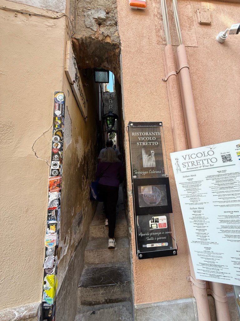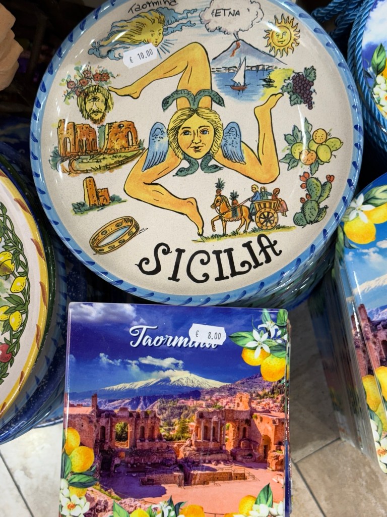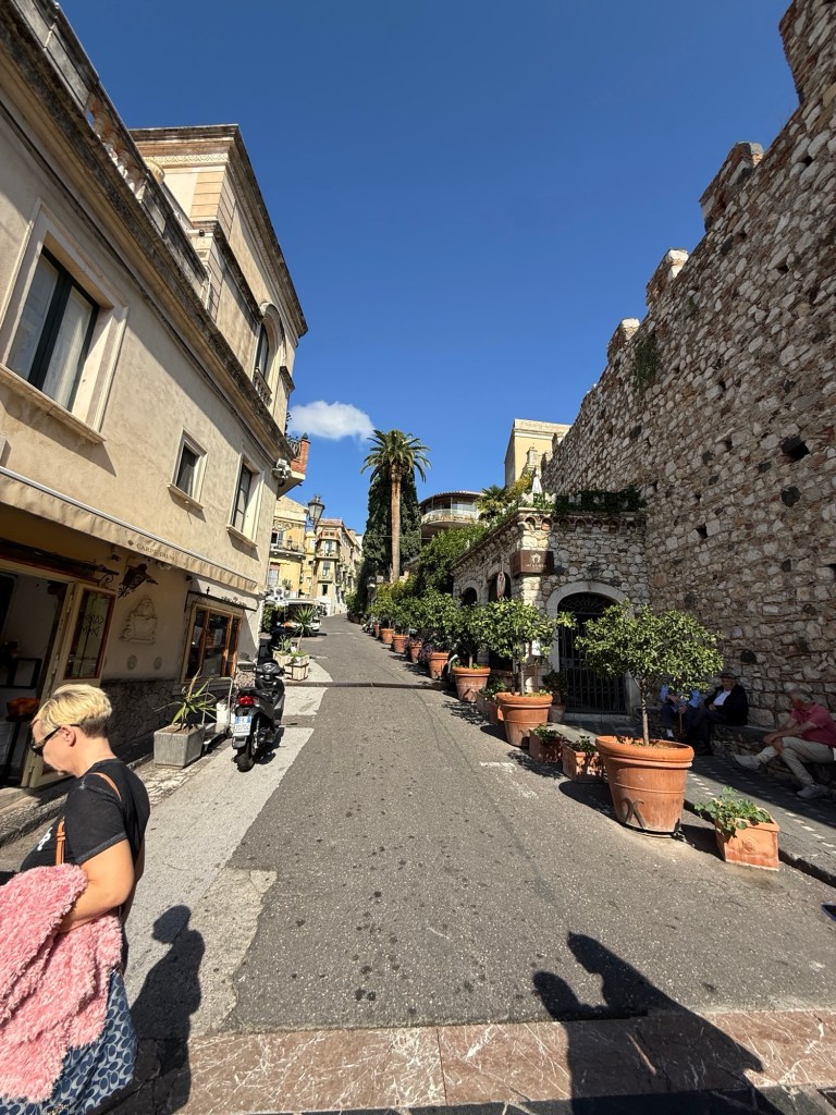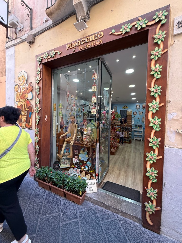 We took the bus to Castelmola and the whole experience was amazing with incredible scenery and windy roads. Once there we wandered in and out of shops and I went off on my own up into the castle itself and enjoyed all of its beautiful overview of the area. I had forgotten my earrings so I did buy a new pair which are the symbol of the wagon wheels in the region. There was a penis bar here which was unusual. We did not stop for a drink.