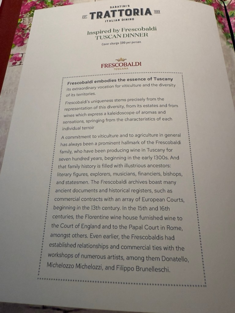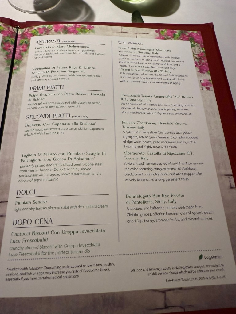 I raced to get dressed up for my Special Tuscan Meal. I was seated with Tom, Scott and Serena. They were friends who met on board and good dinner companions. We all went to O’Malleys after for a nightcap. The meal was delicious but I would not have signed up for it if I had upgraded earlier. My meals in my package have been amazing