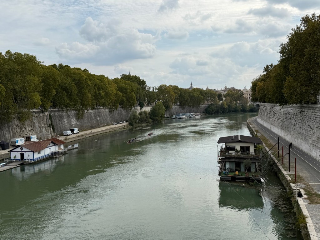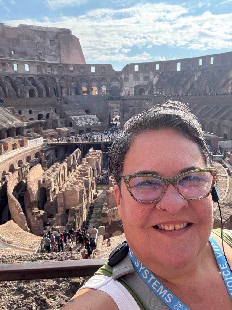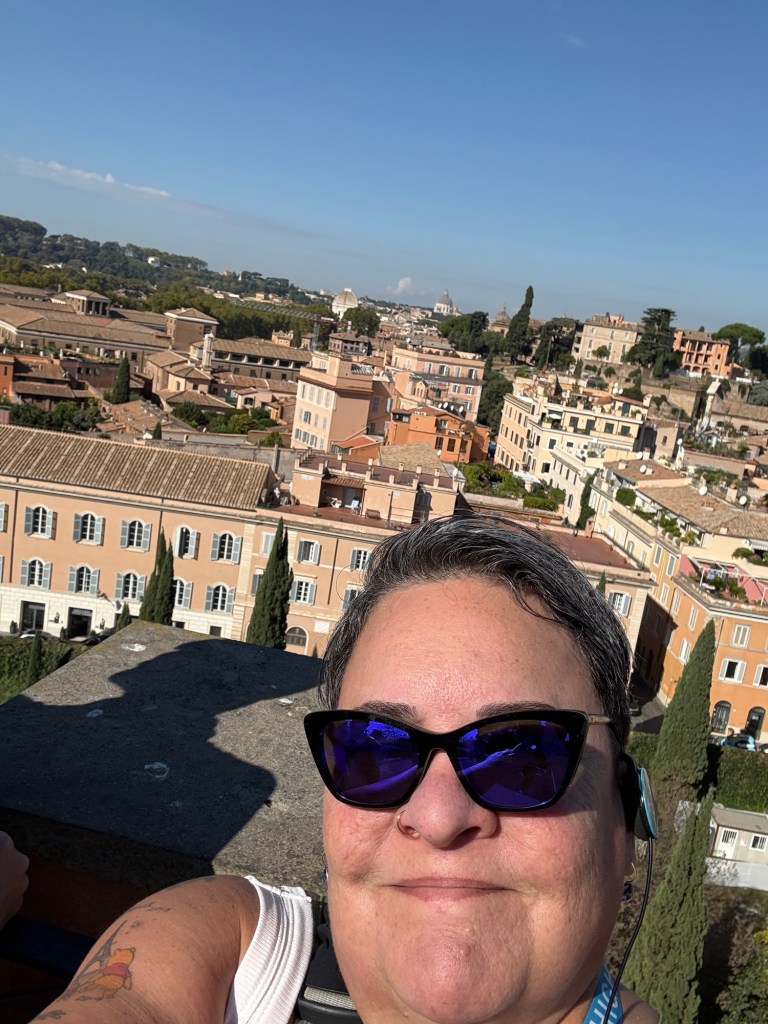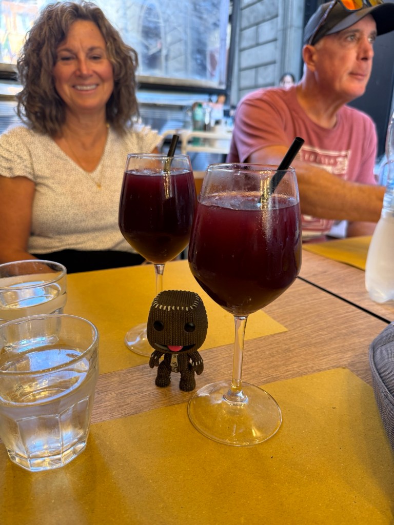 I am so frustrated for you right now because I had this post all ready to go and then I knocked my phone off the bed and dropped it and deleted the draft so I apologize in advance, but I don’t want to miss putting up any of my pictures because I want them to be there forever. If and when I have opportunity, I will fill in more of the blanks but suffice to say we started the day by taking a cab to meet with Fabrizio, who took us on an amazing three hour tour of the Colosseum, Palentine Hill, and the Forum. We had ear pieces and receivers so that we could listen to the very informative narration. After that we went for a nice lunch in an alley which one is want to do. This was followed by a quick peek at the Trevi Fountain which was very busy and then we split ways. I continued walking up to the Lego store so I could get a stamp in my Lego passport and I bought a Vespa for my Sackboy to ride because I haven’t brought him out very often this trip and I’m feeling guilty. I also broke the zipper on my bag which I had used since my trip to Peru in 2013 so I found a street vendor with a lovely green one that I wanted for €45. I transferred all my stuff into it and then went down the next alley and tossed away my old bag in a garbage can. Then it was just walk about half an hour back to our air bnb. It was a beautiful walk. I crossed the river Tiber and enjoyed the people and the scenery along the way. I did manage to mess up by rolling two or three times on the cobblestone but neither ankle suffered from such things. I stopped at a cute little clothing market, a pop-up, we would call at home and I purchased a cute linen white skirt for our white night on the ship and then came back to the room to strip from all of my hot body clothes and built my Vespa for my Sackboy then I was trying to have a nap, but I don’t remember if I actually did it before the door opened and Dave and Deb were back. I said yes that we head for something to eat soon as I have been neglecting myself.. once I got ready we walked down the main road here that we are on and found a spot that looked relatively reasonable and delicious. it turned out that we had the best servers around, the food was soooo good and we had a good talk. It got a bit emotional for me as I brought up a conversation that I had shut down earlier. Dave apologized and I bought us a fancy bottle of delicious wine to bring back and share.